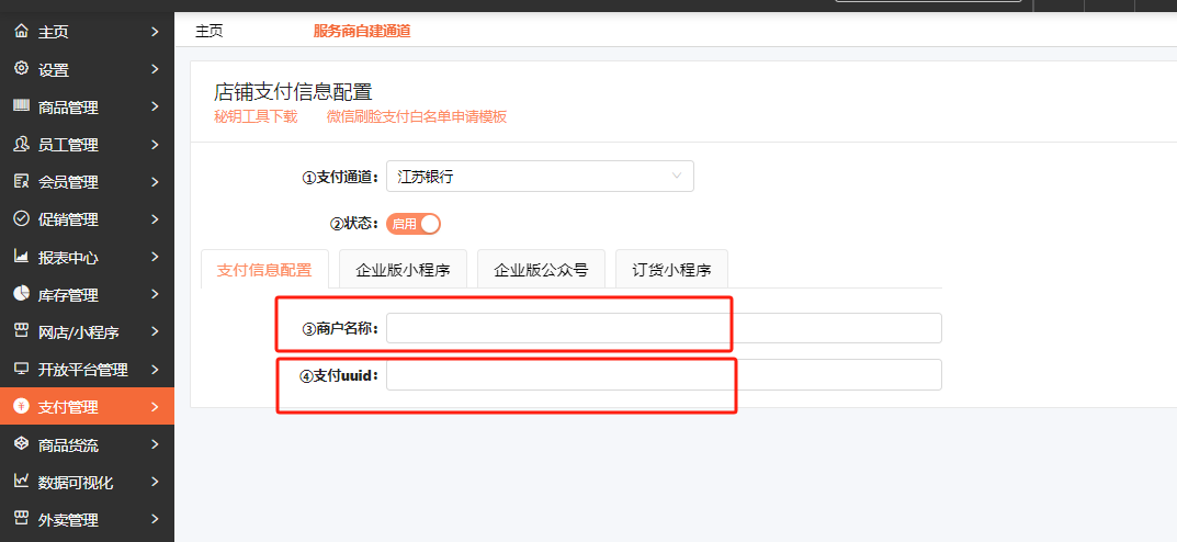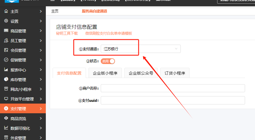 2.新建支付通道。支付管理-服务商支付通道-新建(如下图)