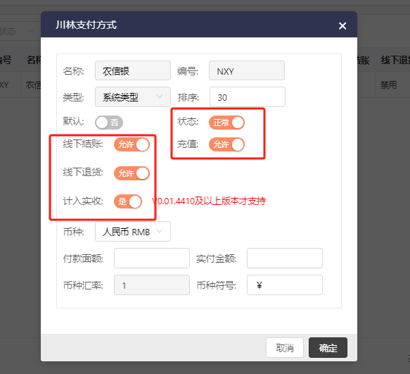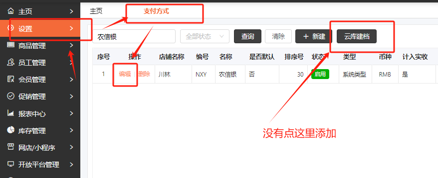 4.进入后台设置里选择支付方式把农信银启用。(如下图)