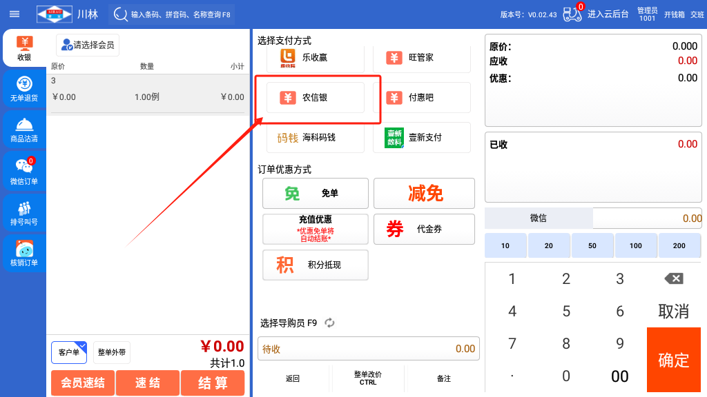 6.前台结账,选用【农信银】支付,测试是否正常支付成功