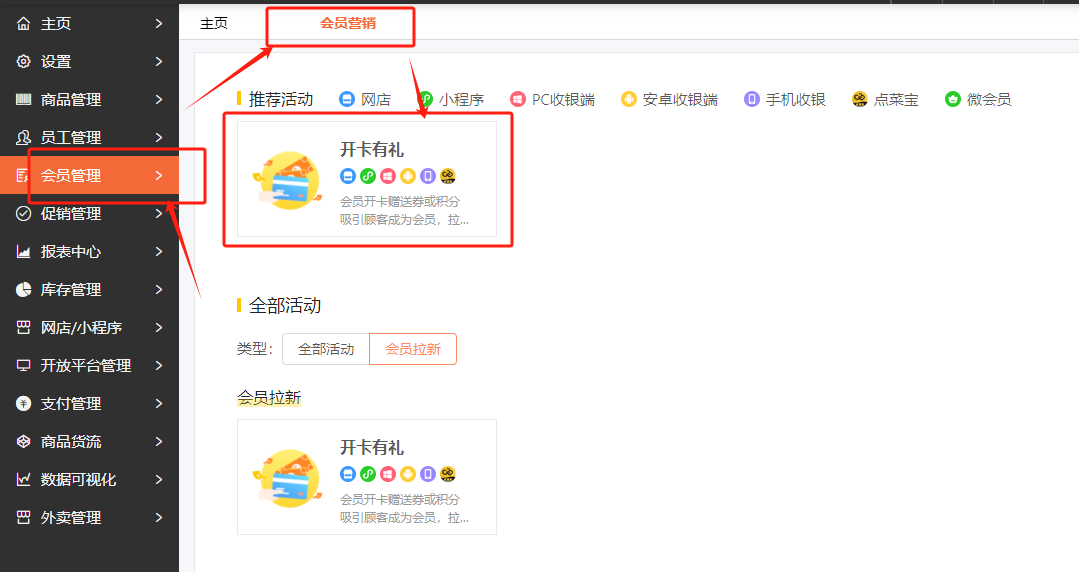 美食云旗舰版会员营销开卡有礼活动教程
