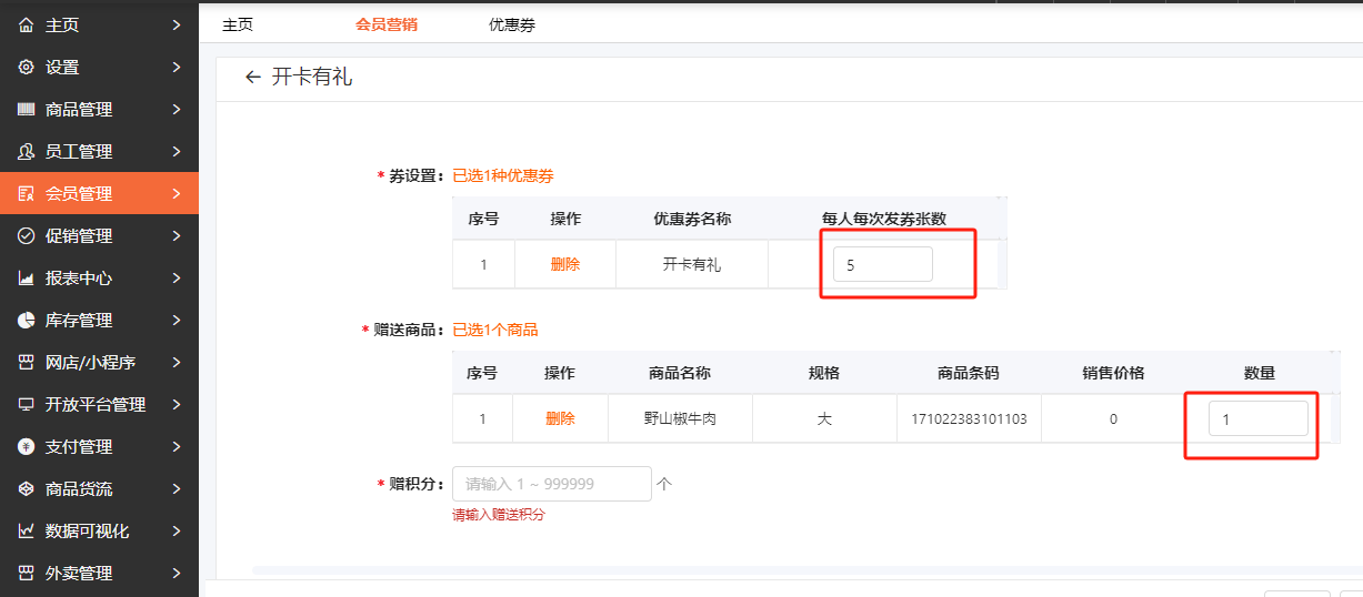 3.点击开卡有礼设置活动信息,活动可以赠送优惠券,商品,积分,优惠券跟商品可设置多张多个,赠送多少张