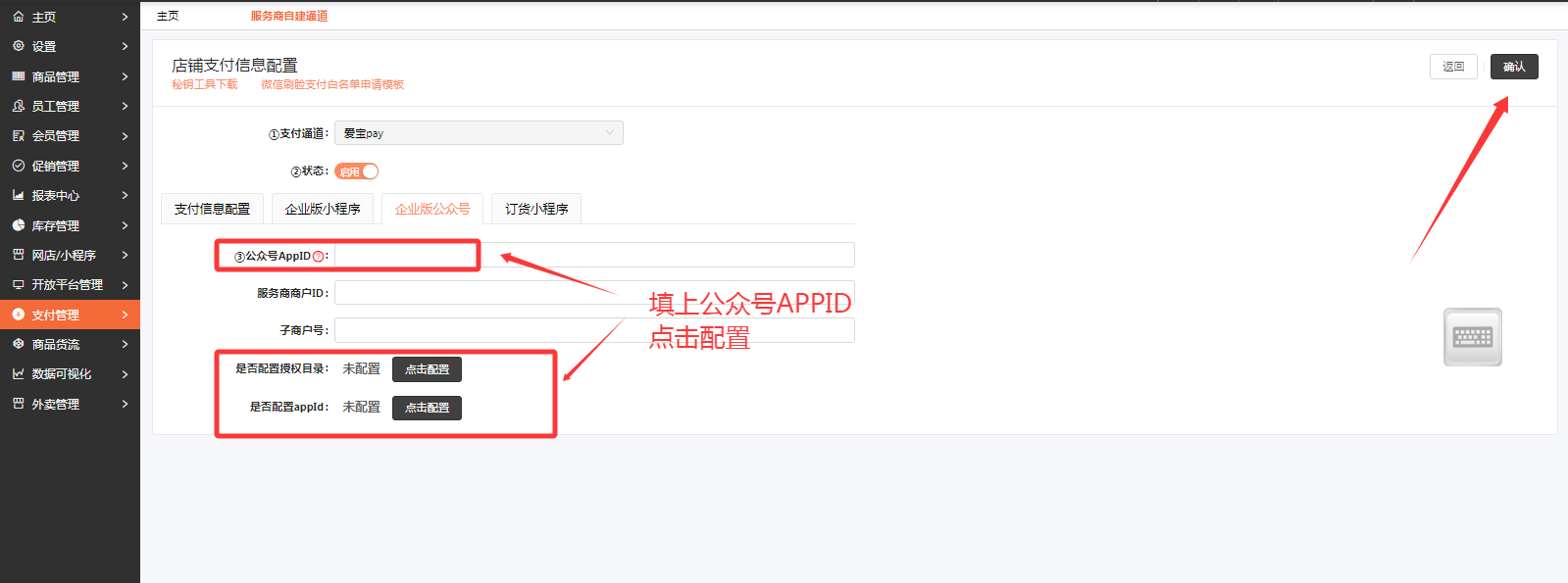 审核通过后,在 服务商自建通道 里面会自动生成【爱宝pay】的支付参数