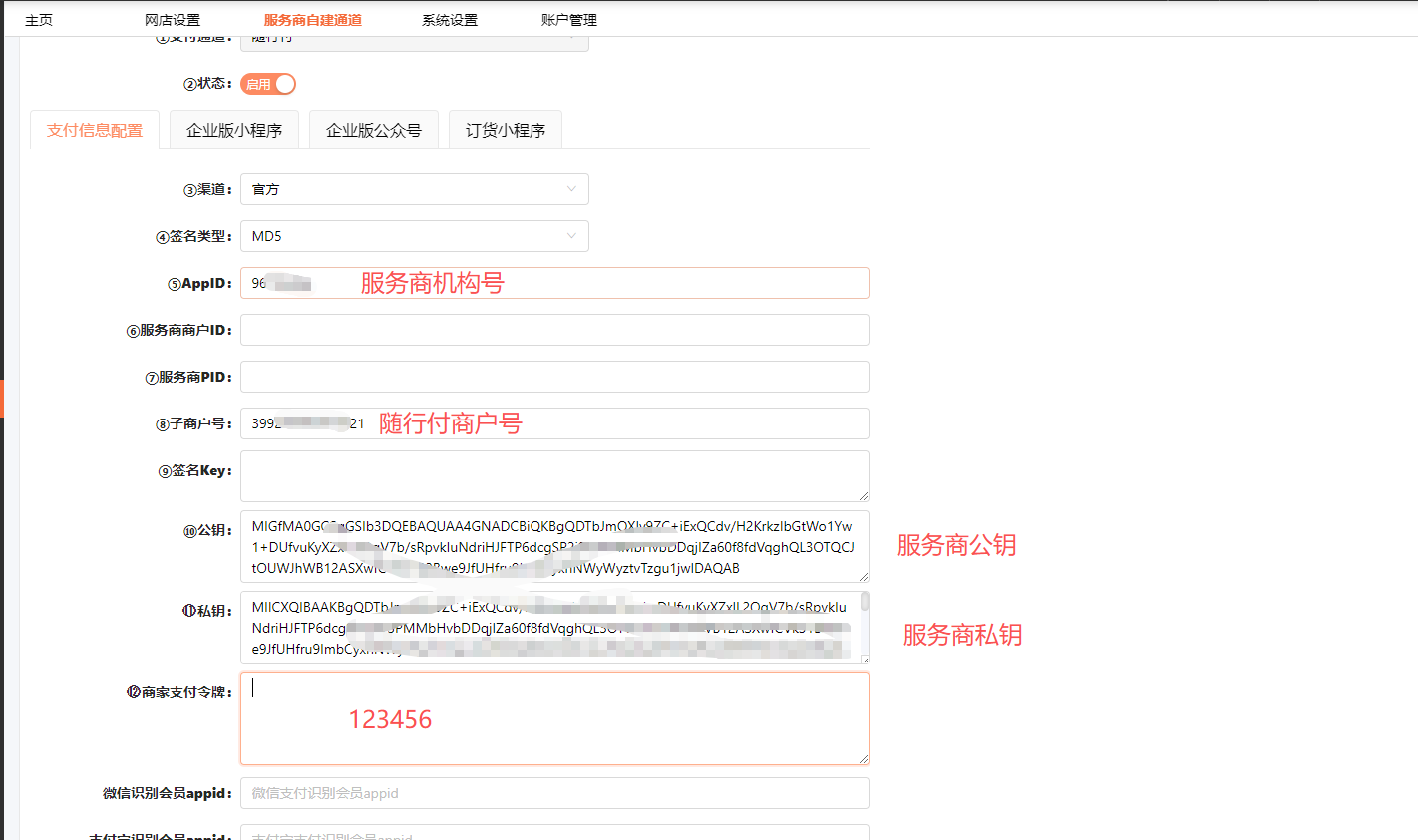第二步,在【支付管理】--【自建支付通道】中新随行付支付方式