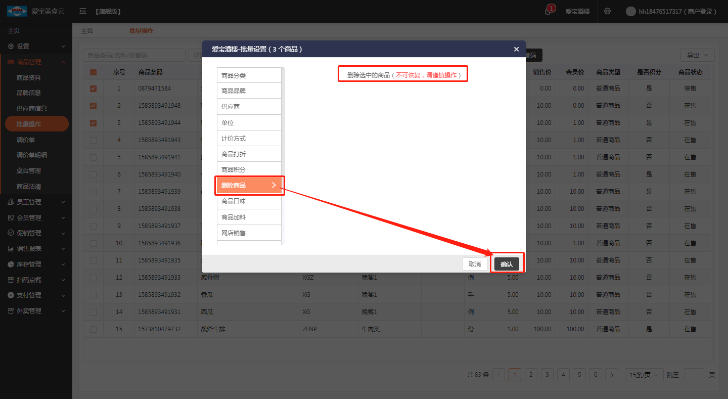 第三步:删除商品--->确定(注:删除选中的商品(不可恢复,请谨慎操作));