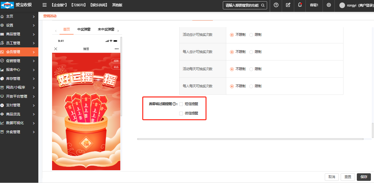 如果奖品是优惠券,可以设置优惠券提醒,提前提醒天数必须小于有效期大数才能发送短信或微信提醒;微信提醒需授权微信公众号并发布电子卡才能推送。由于微信限制,微信后台无法添加“兑换码到期提醒” 模板的商家推送过期提醒消息会失败