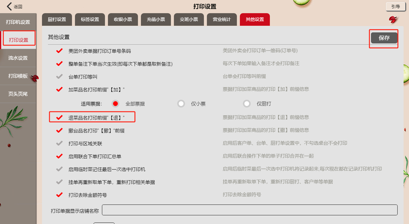 在其他设置中,勾选打印【退】字,保存