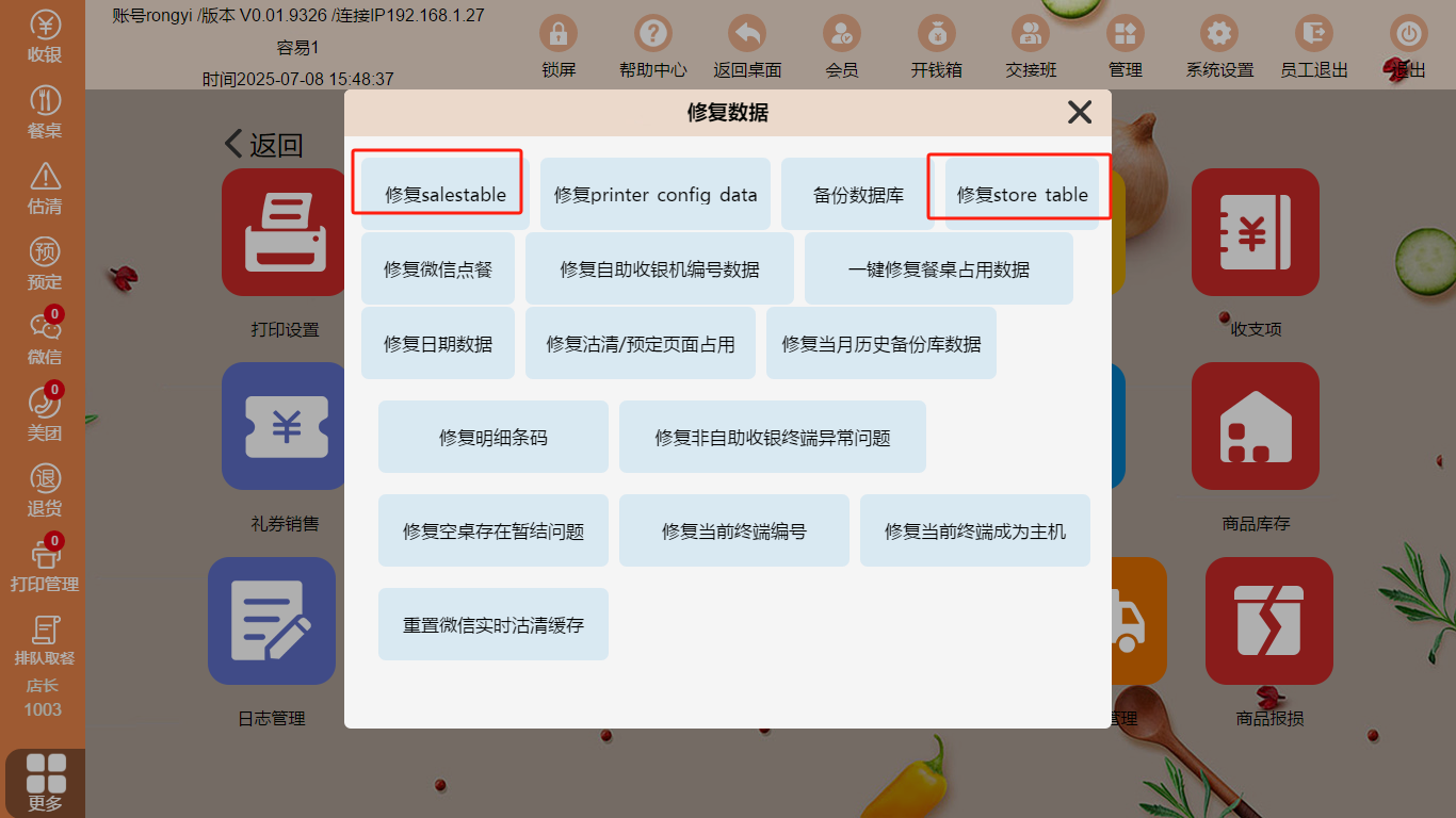 收银端非点餐界面,点击键盘上的f10,弹出修复数据授权,输入密码:aibao2019,点击授权