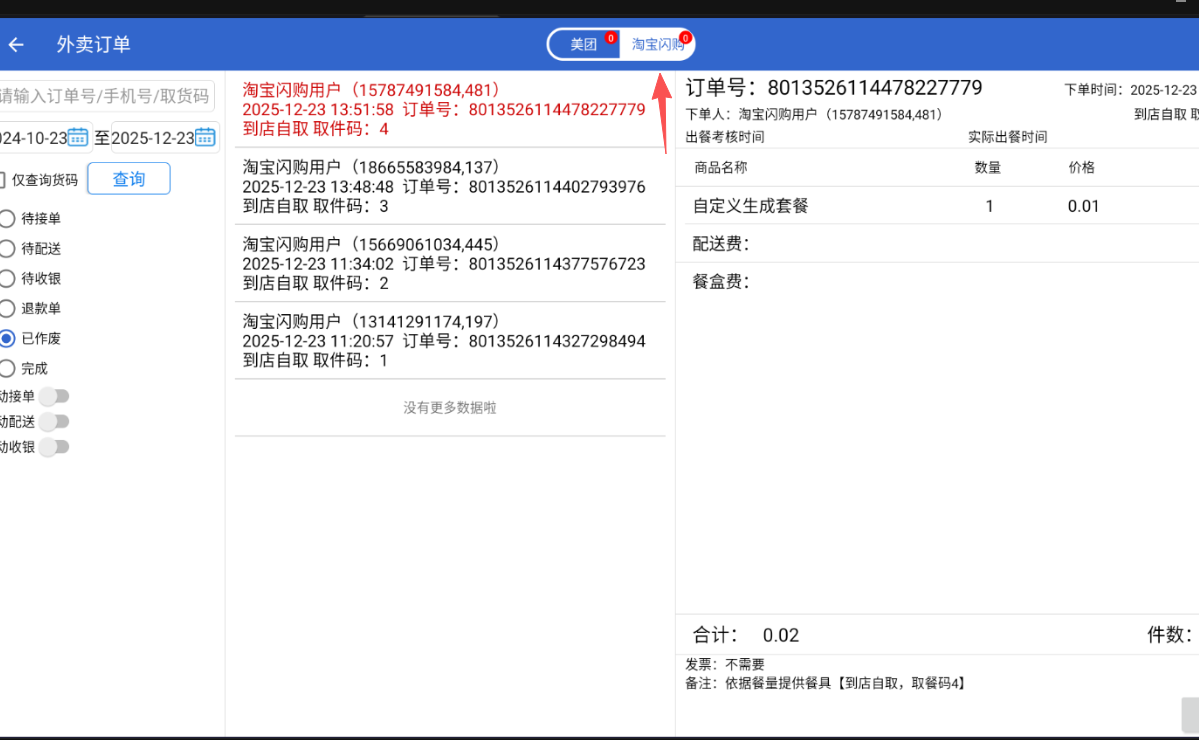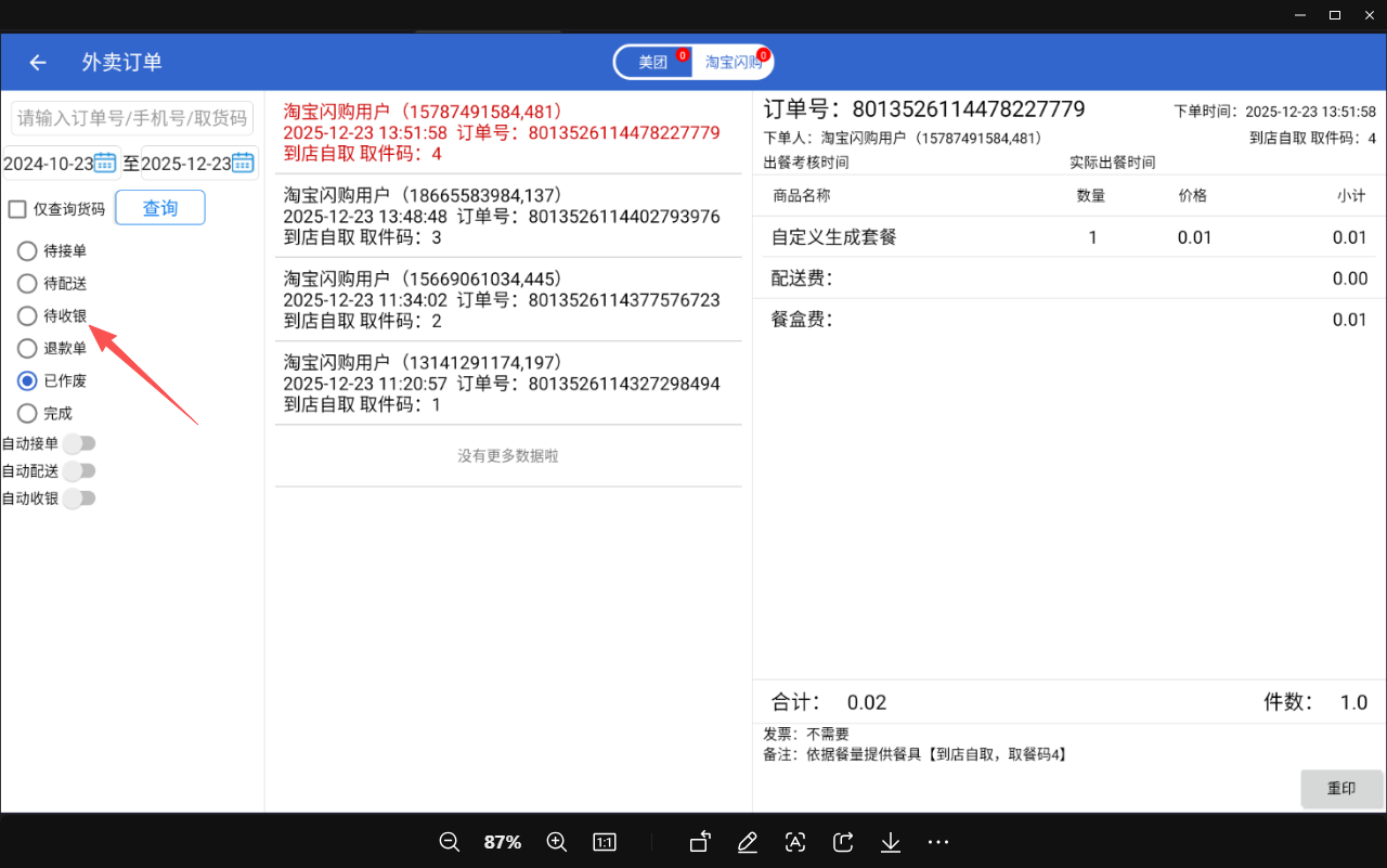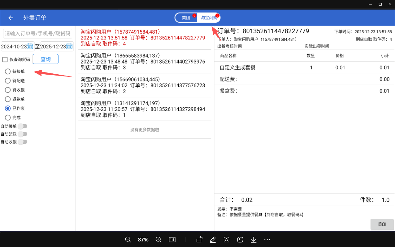 8、我们可以到美团下单,下单后前台就会进行提示【需要在系统设置中切换成手动接单】(如下图)