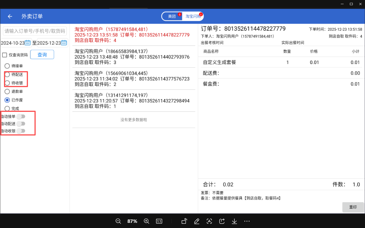 7、打印机设置勾选打印美团/淘宝闪购外卖打印单据