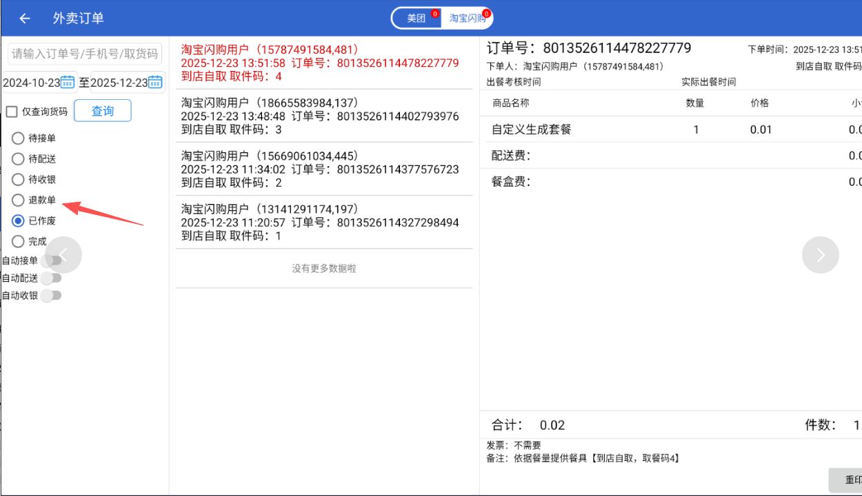 12、如果申请退款,点击【作废】即可进行处理,退款同意,金额是马上返还的。(如下图)