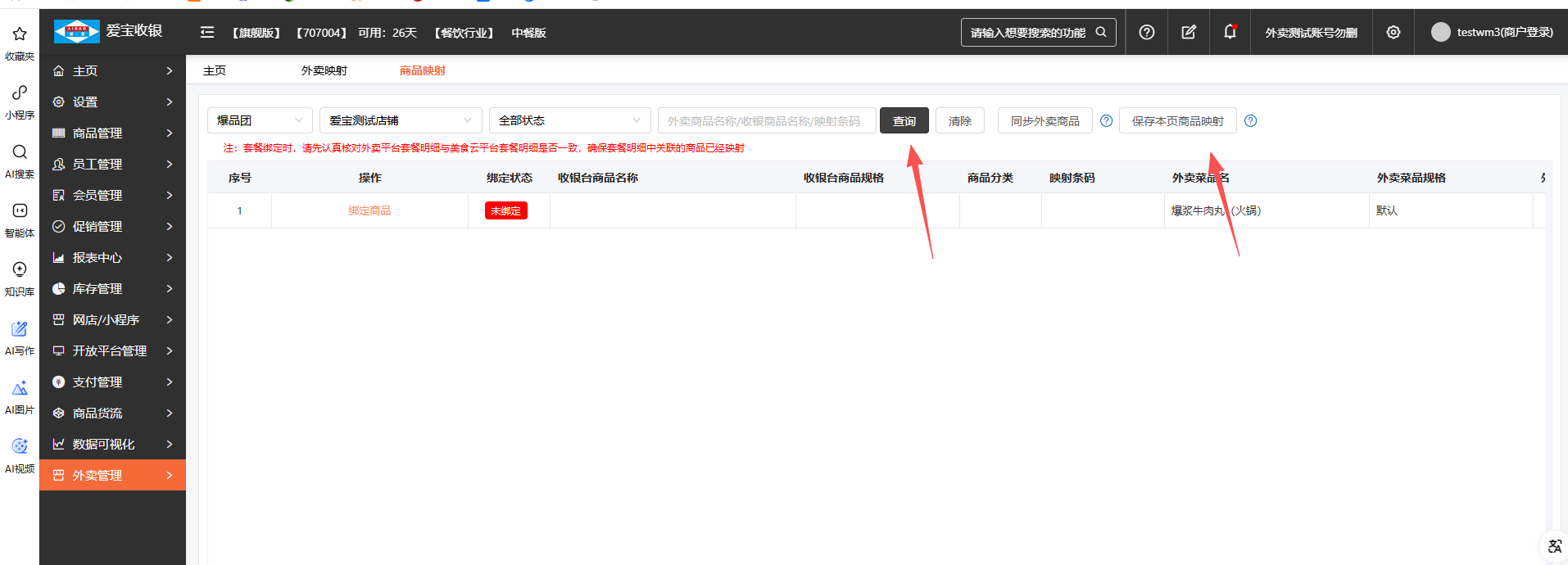 之后,我们再点击【外卖管理】---【商品映射】中,再点击【查询】,最后再点击【保存本页商品映射】即可