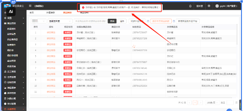 【保存本页商品映射】:将美食云商品名与 外卖商家平台的商品名都保持一致才能成功映射