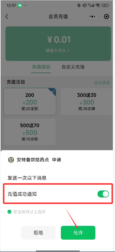 进入小程序,下单或者点击会员充值,会弹出一个通知,开启允许通知