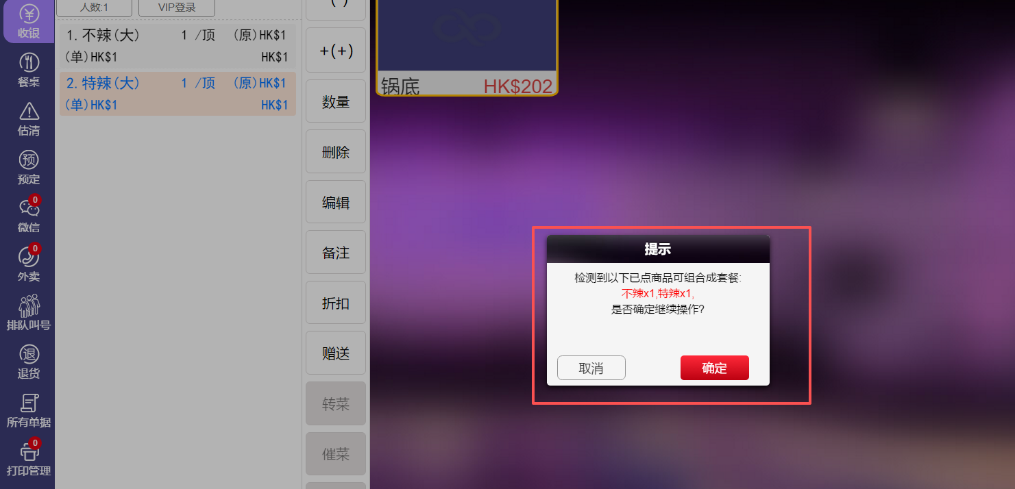 点一个套餐a内的商品,再点套餐a,会提示是否需要组合套餐(如下图)