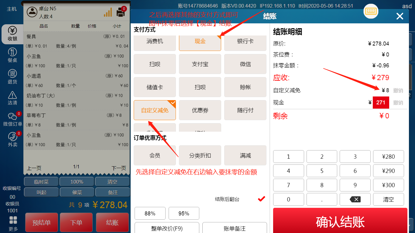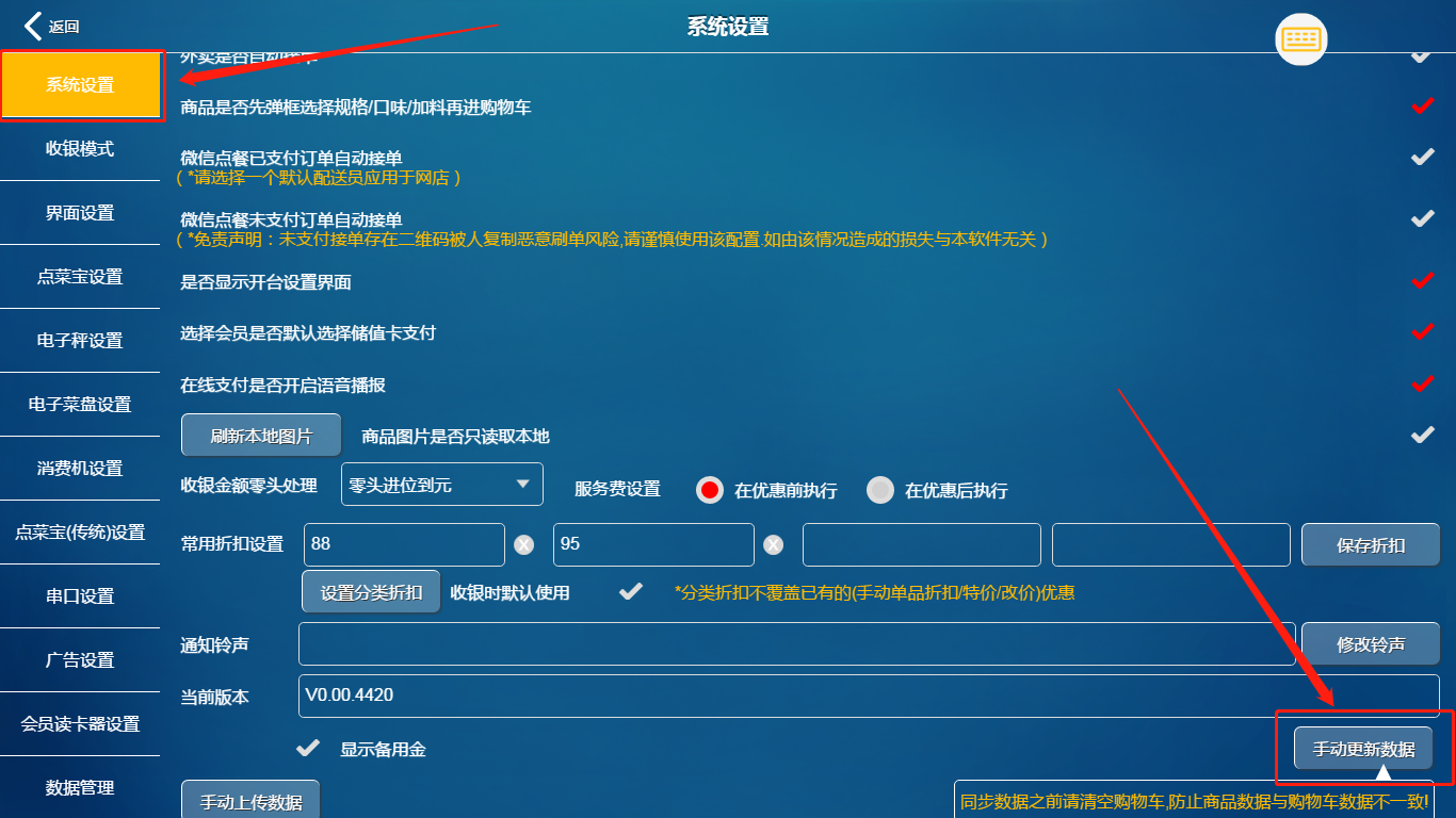 给菜品赋予可打折的权限后,返回前台,【系统设置】内手动同步一下数据,再结账即可