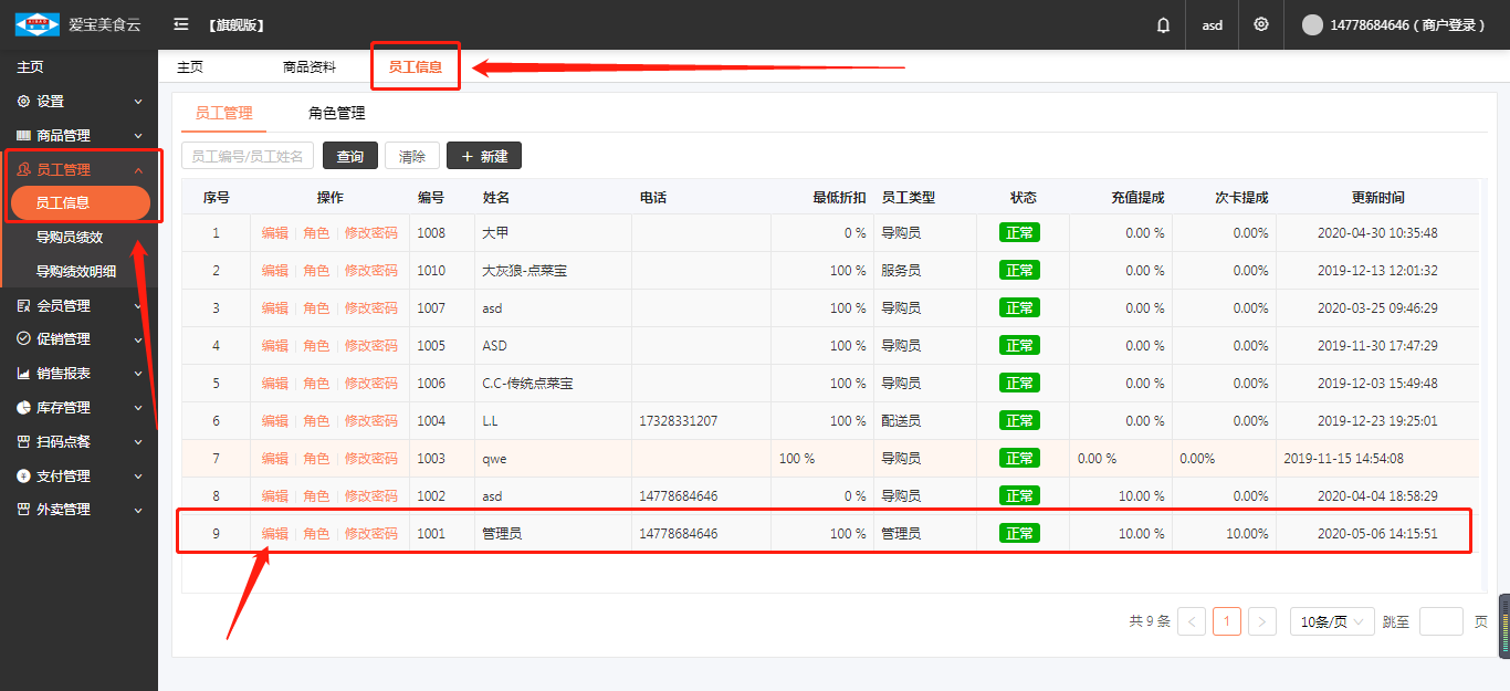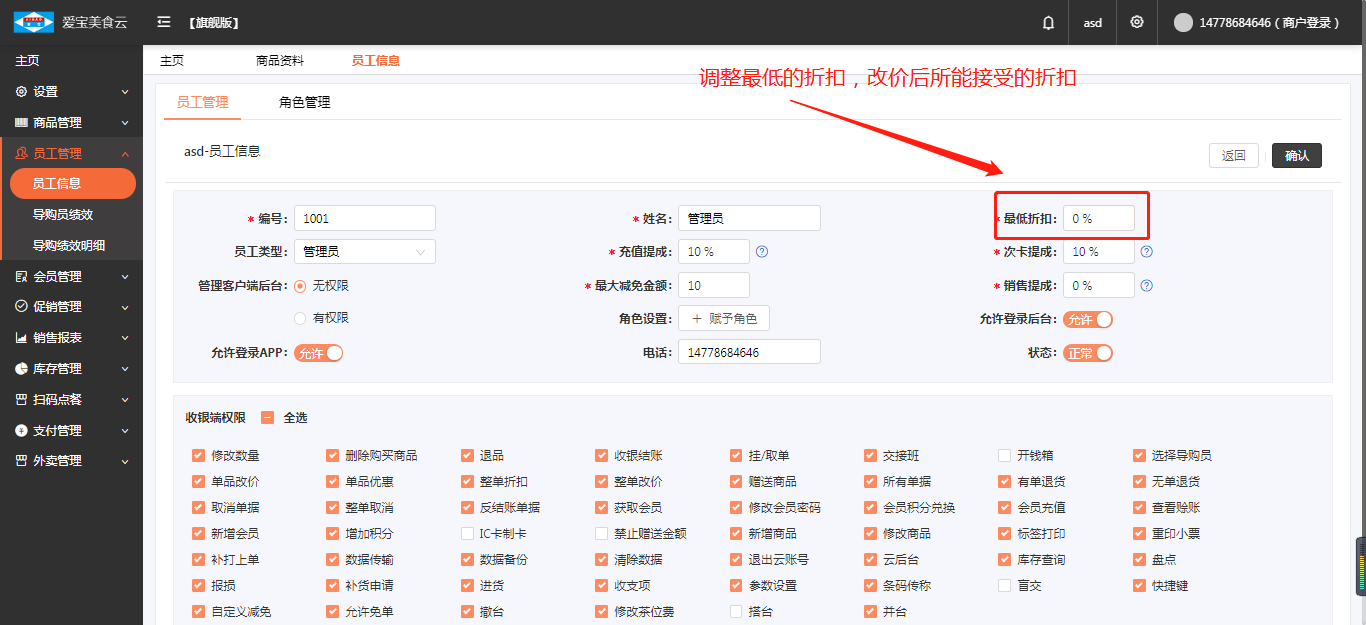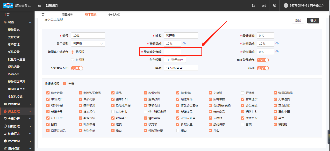 再点击【员工管理】--【员工信息】,在设置权限中,赋予这个员工最高能减免的金额,