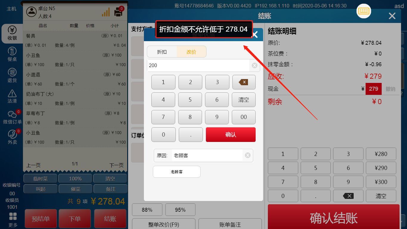 二.当整单改价时提示【折扣金额不允许低于xxx金额】时,