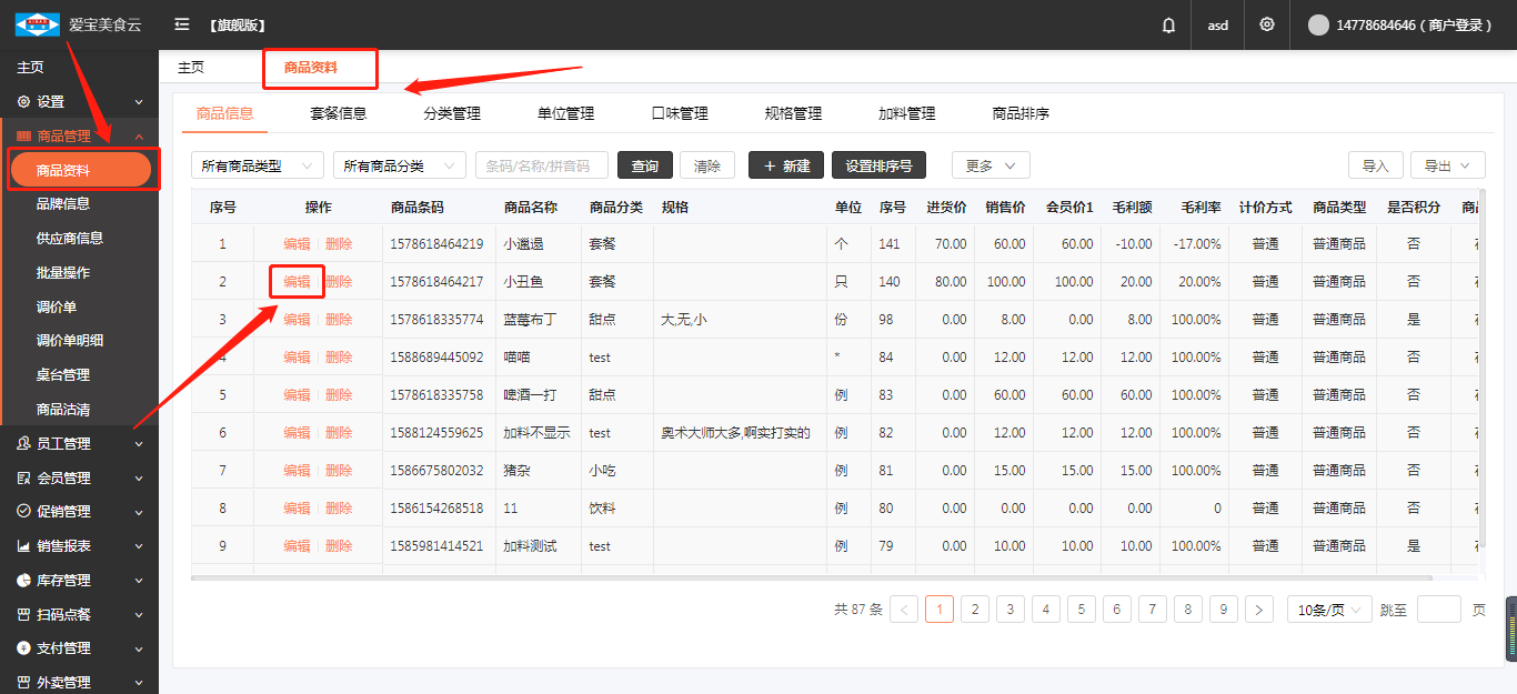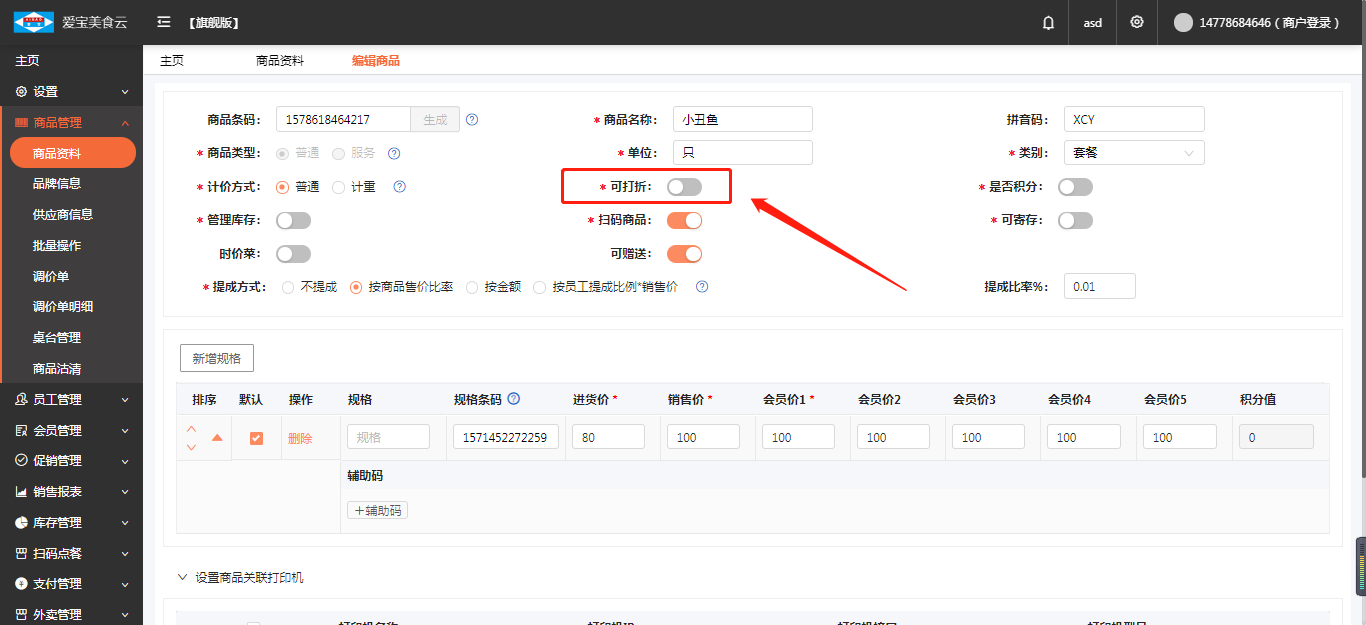 先登录网页后台(v.aibaocloud.com),在【商品管理】--【商品资料】中,找到账单内这些商品,查询下是否赋予了【可打折】的权限