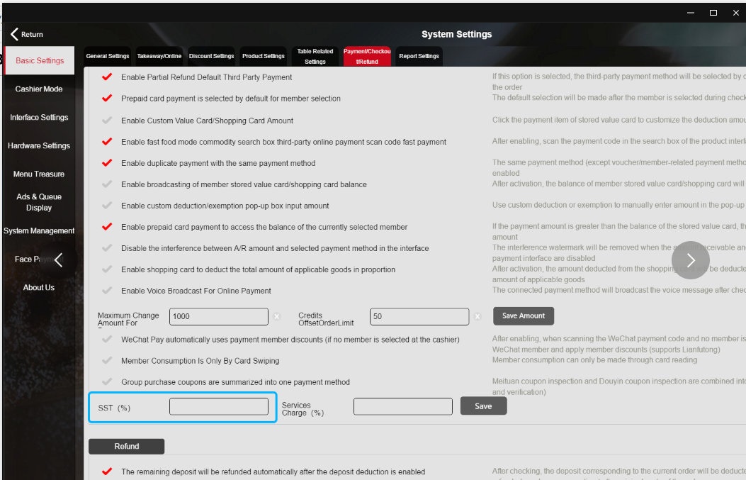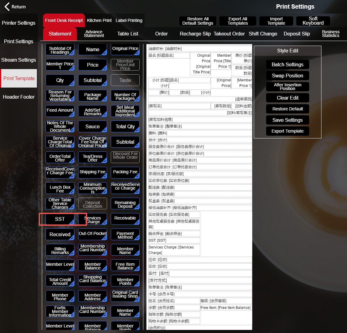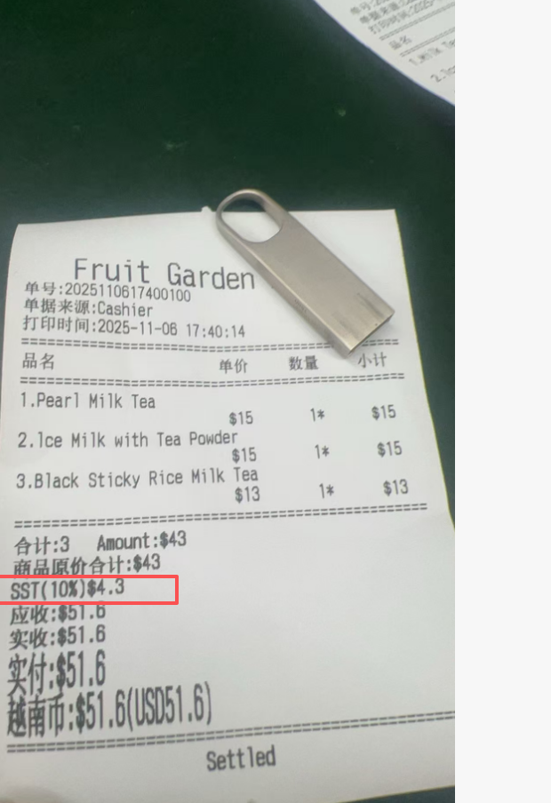 计算公式:SST(税费) = ( 订单原价 - 订单优惠(单品优惠+整单优惠+订单抹零) ) * SST百分比, 订单优惠不包含 免单、自定义减免、优惠券等支付优惠