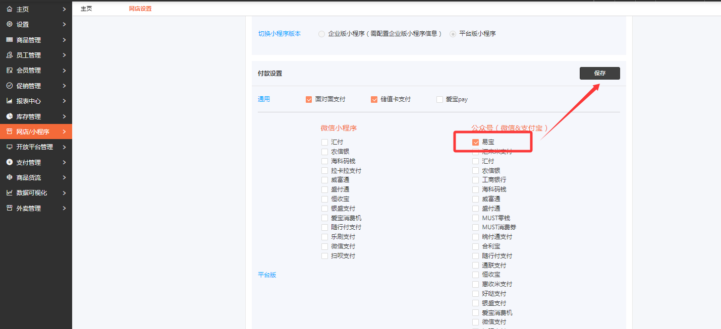 6.网店/小程序---网店设置--付款设置 平台版 勾选 易宝支付 保存