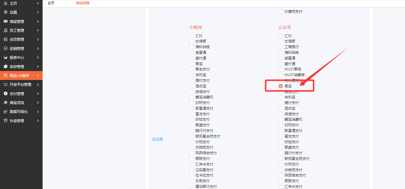 6.网店/小程序---网店设置--付款设置--企业版 勾选 易宝支付 保存
