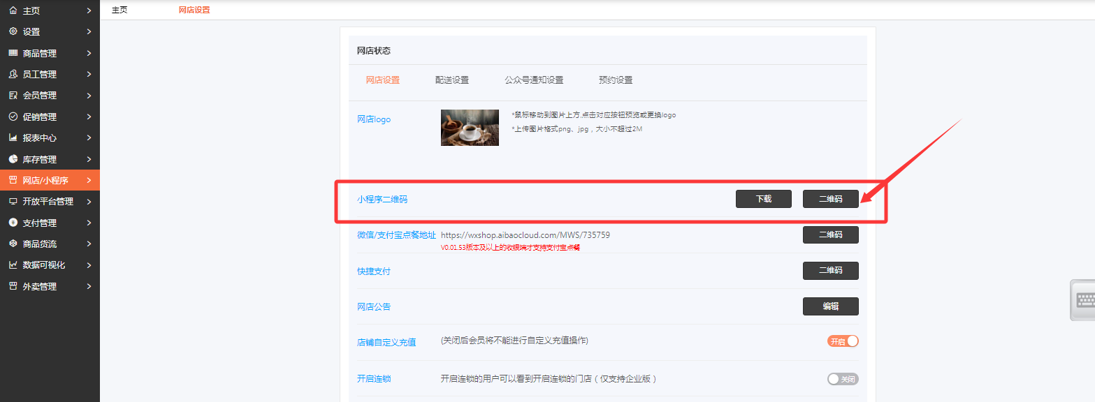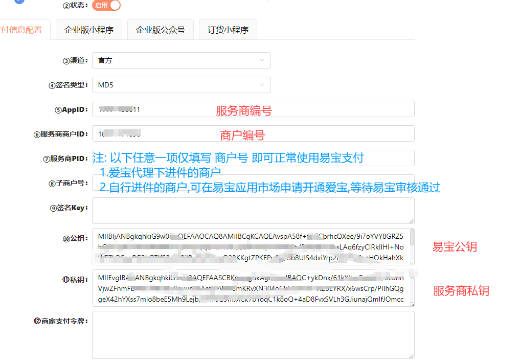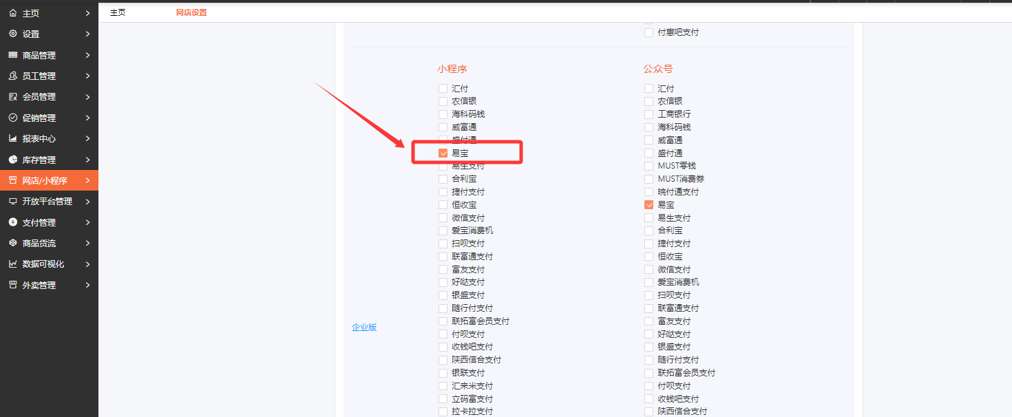 6.网店/小程序---网店设置--付款设置 企业版小程序 勾选 易宝支付 保存