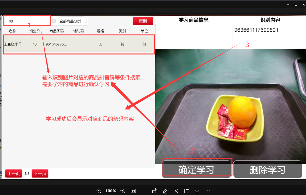 1.2输入需要学习的商品名或商品条码等条件进行搜索商品,确定需要学习的商品后点击确定学习,学习成功即可会显示对于商品的条码内容(如下图)