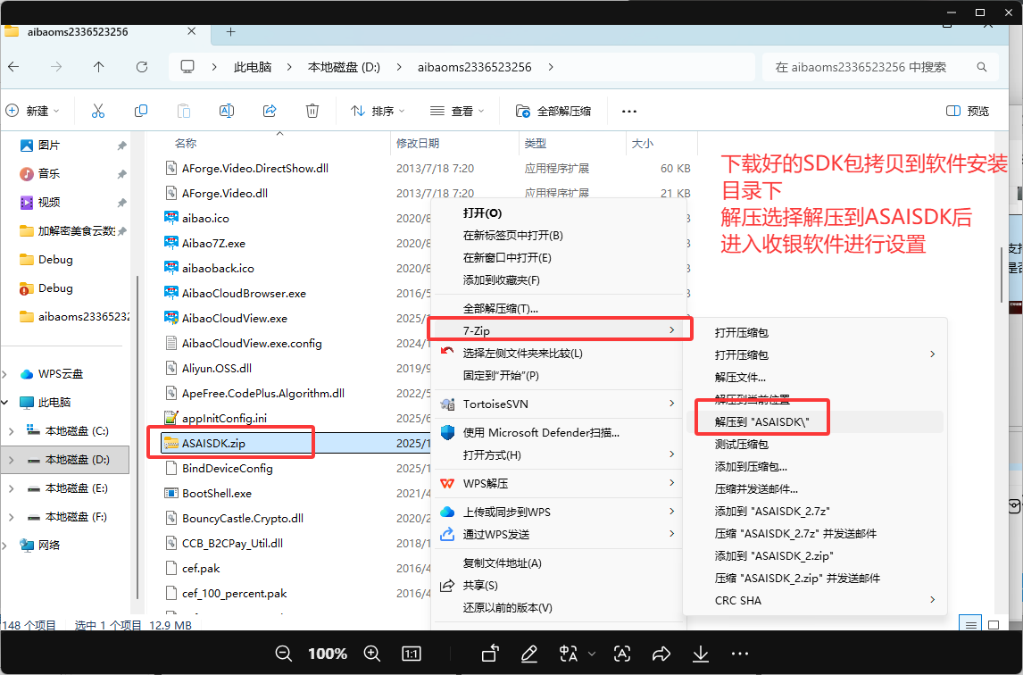 下载好的SDK包拷贝到软件安目录下解压选择解压到ASAISDK后进入收银软件进行设置