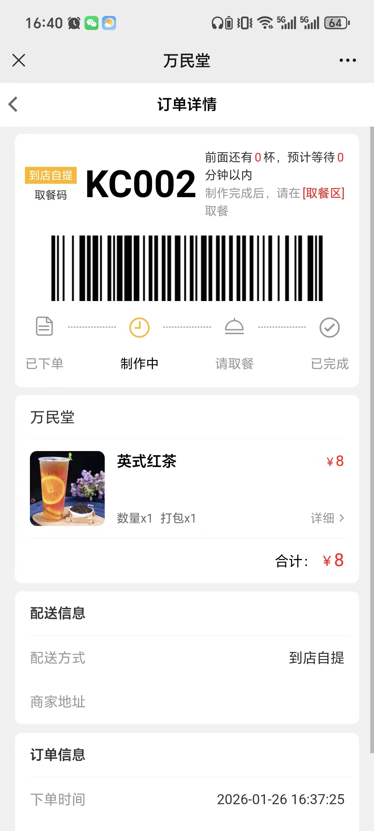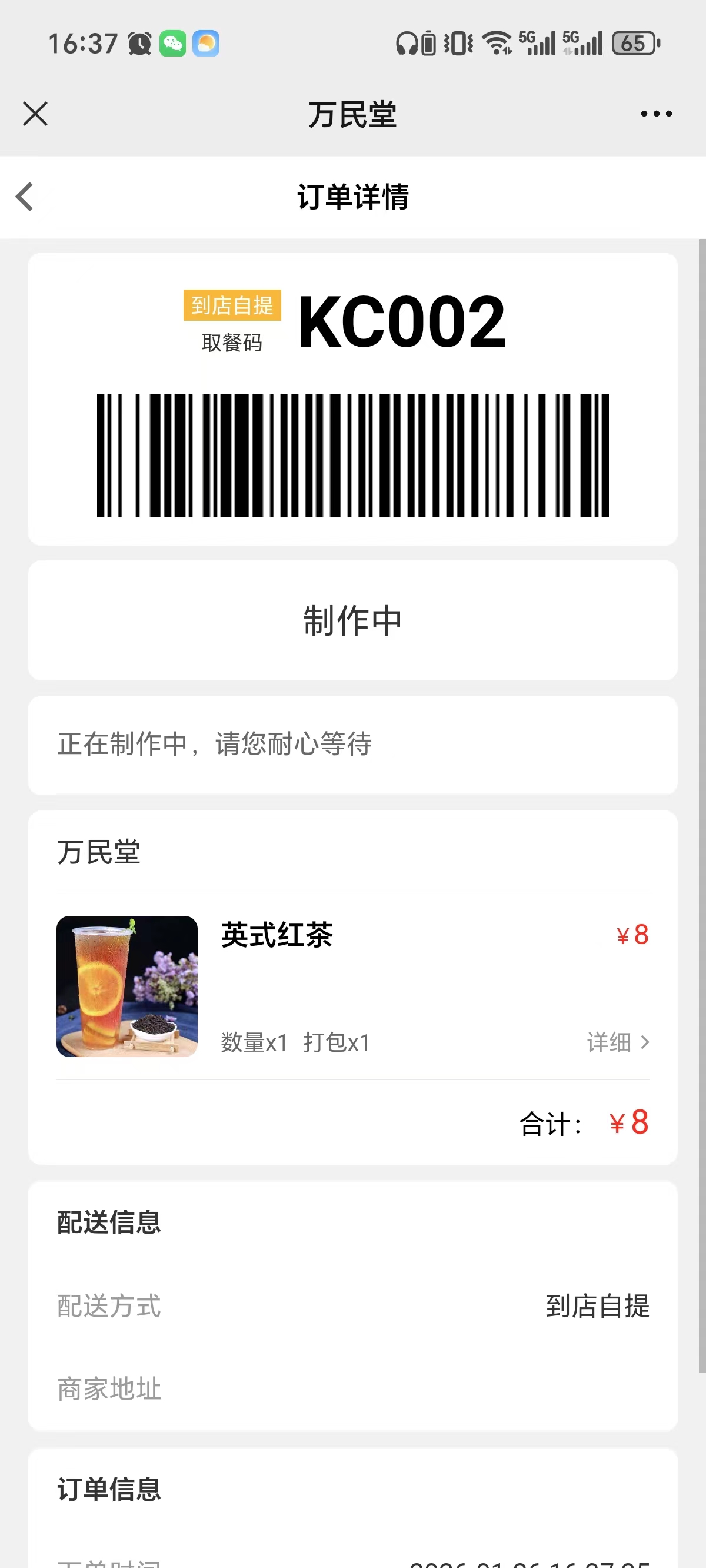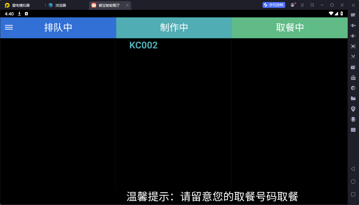 点击【制作】,扫码点餐页面和叫号屏显示为【制作中】