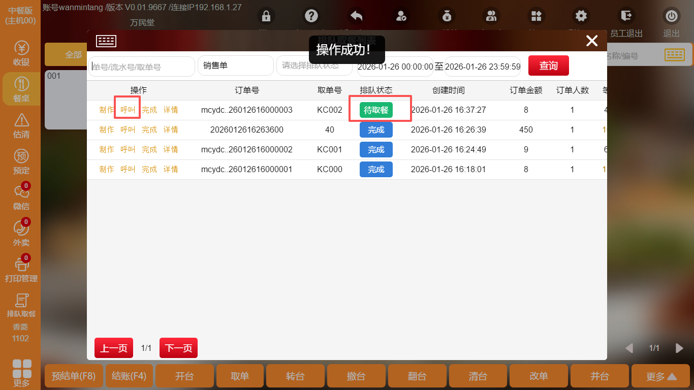 点击【呼叫】,扫码点餐页面显示【请取餐】,叫号屏显示为【待取餐】