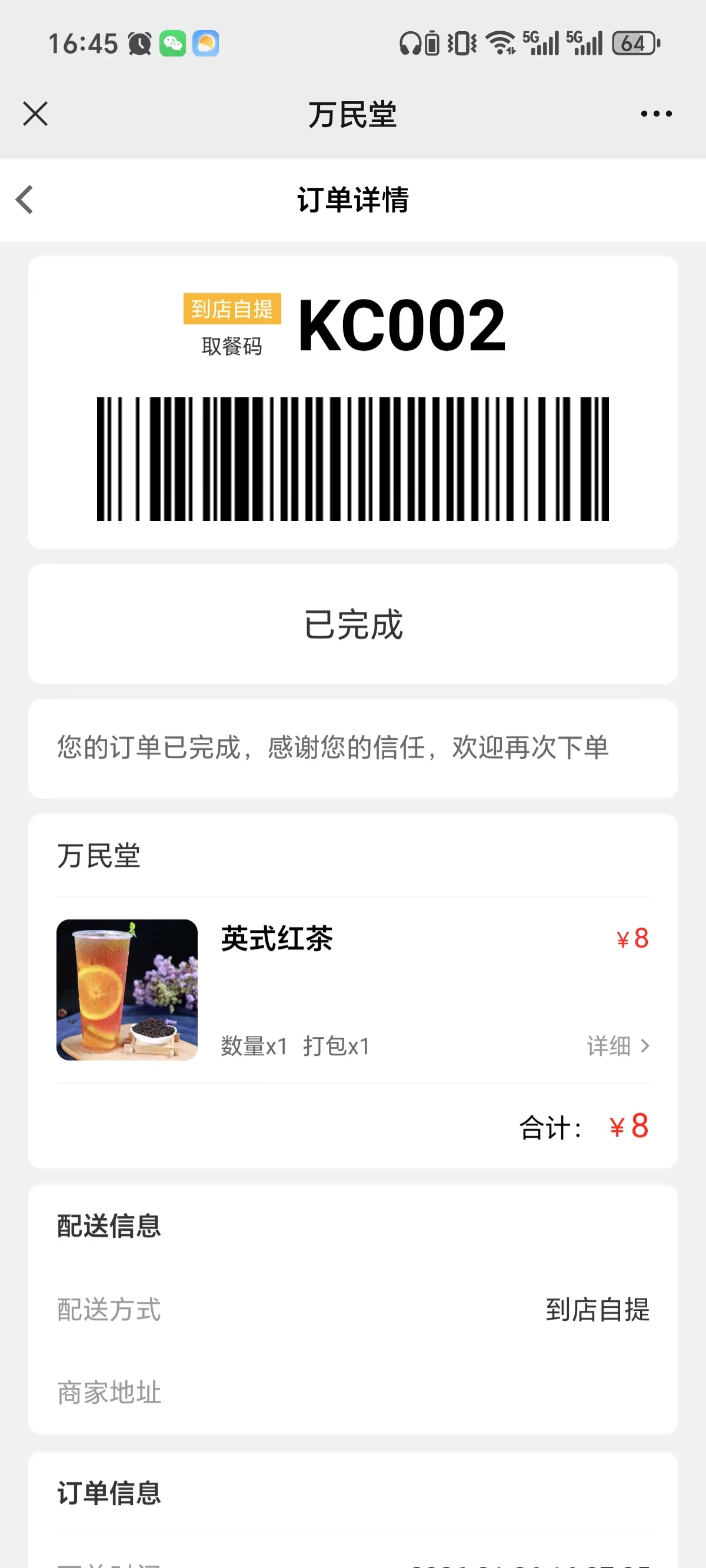 点击【完成】,扫码点餐显示【已完成】,取单号消失在叫号屏上。