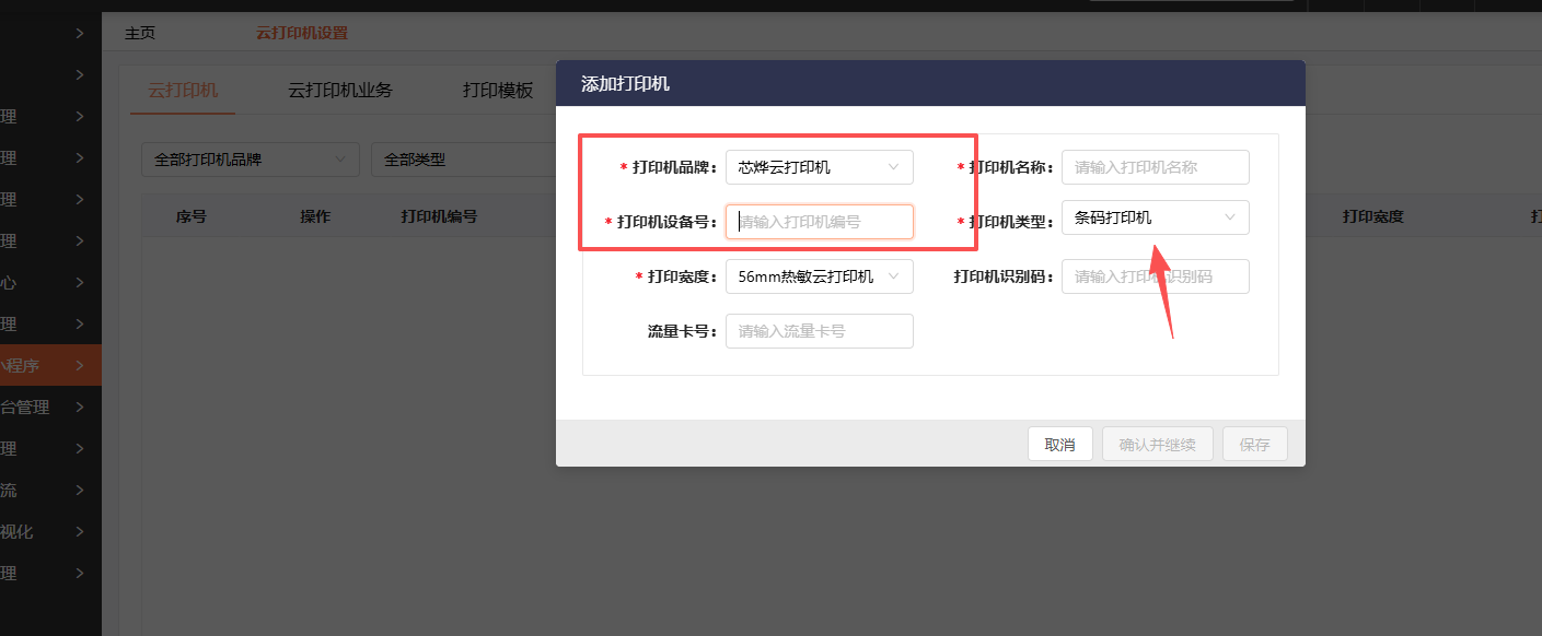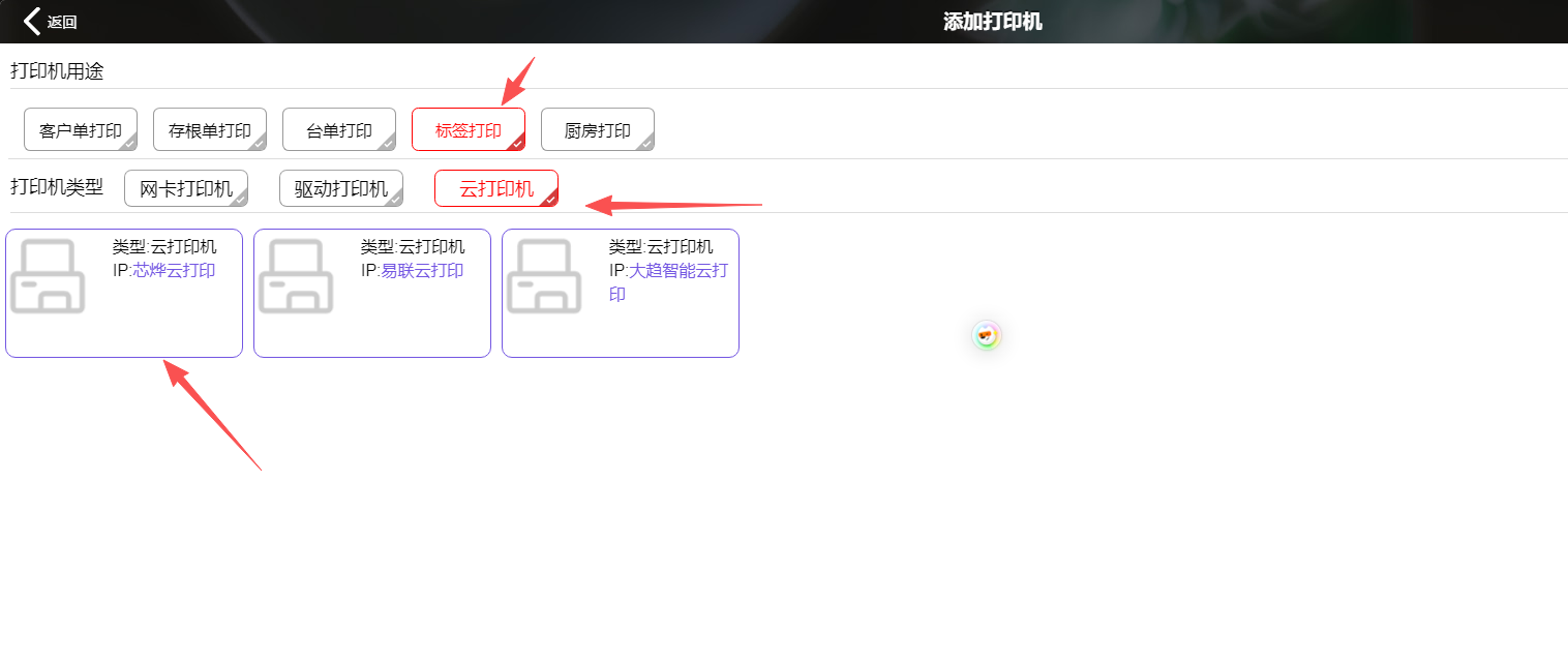 登录前台--点开打印设置---添加打印机---选择打印机用途---选择云打印机