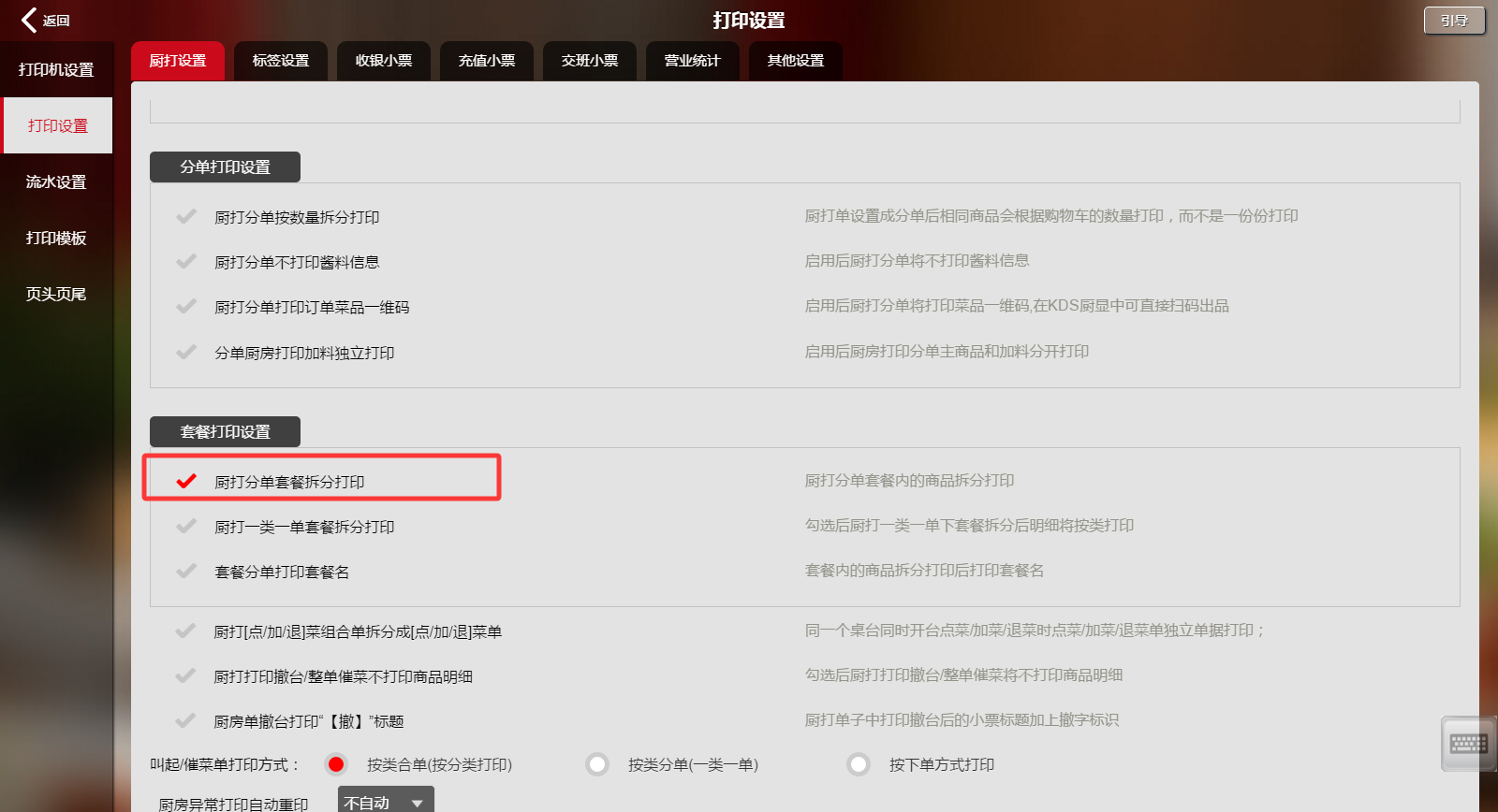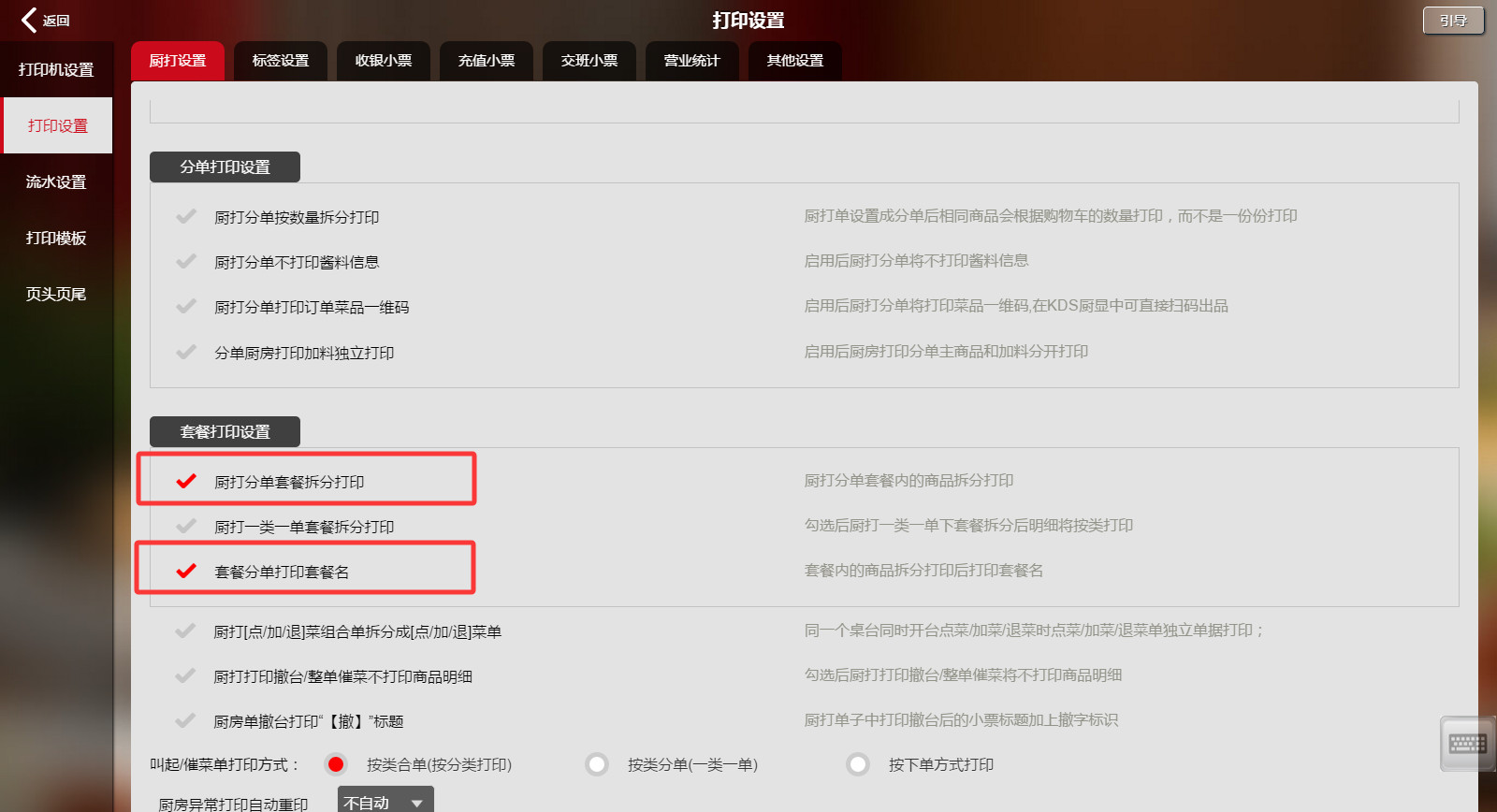 美食云旗舰版套餐分单拆分打印,打印套餐名设置教程