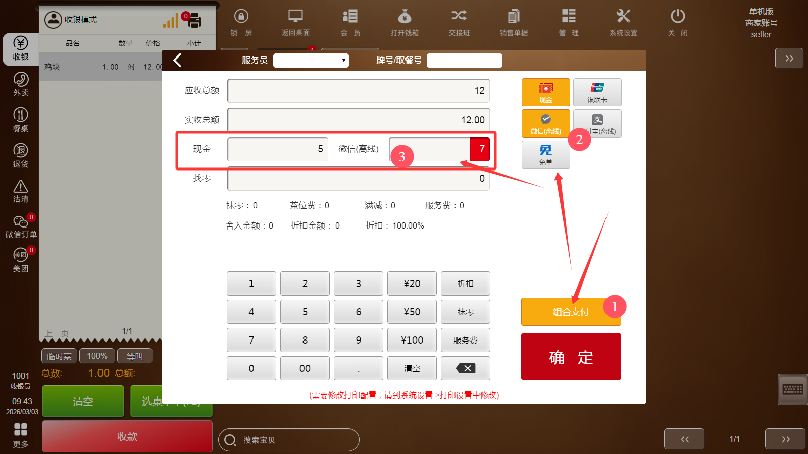结账界面,先点击右下方【组合支付】--选择支付方式--输入金额