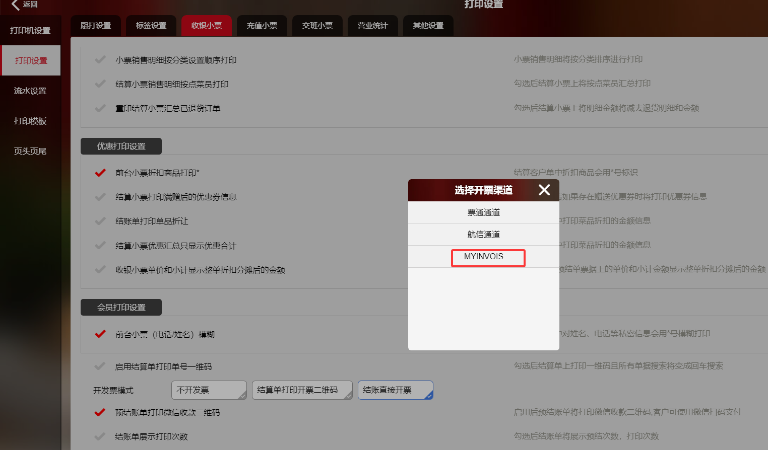 打印设置--收银小票--结账单打印开盘二维码--MYINVOIS