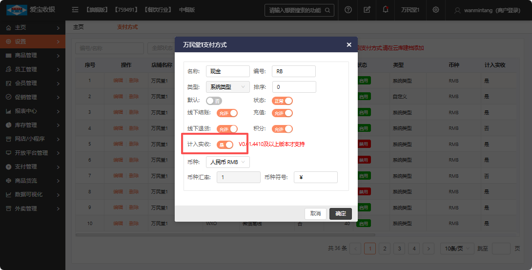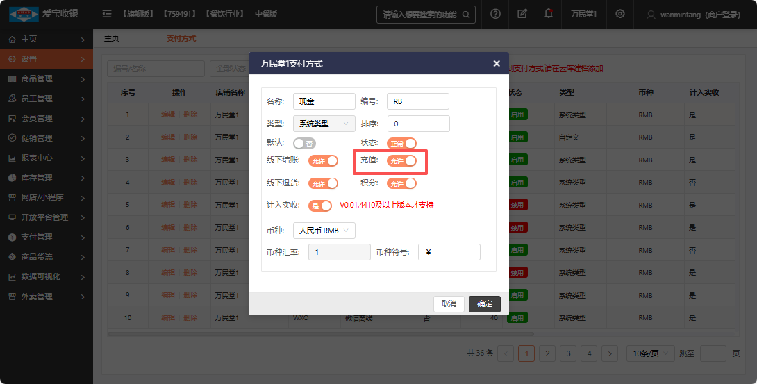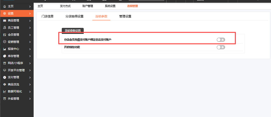 该功能开启后,分店充值支付方式全部调用总店的支付方式,分店无法单独控制支付方式,根据客户自己的需求,如果是需要总店控制,就在总店账号建立支付方式,如果不用,关闭即可。