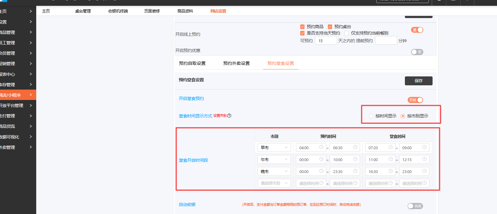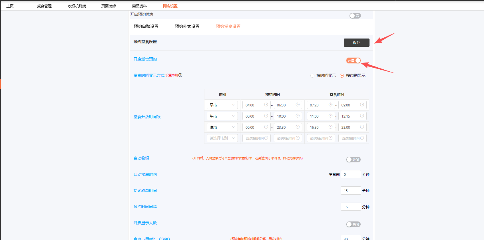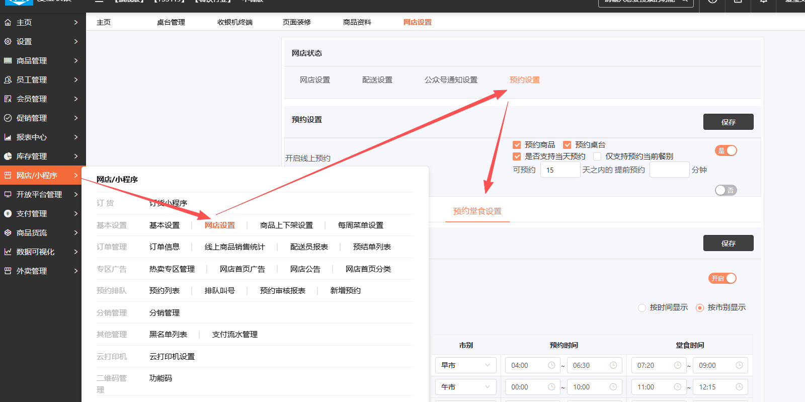 网店/小程序→网店设置→预约设置→预约堂食设置→ 开启堂食预约