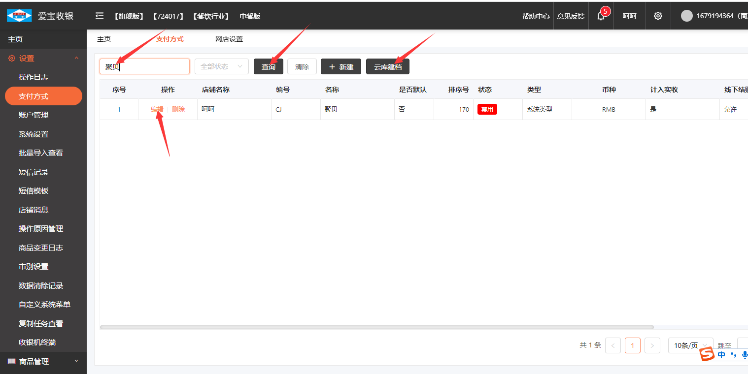 4.在后台【设置】中选择【支付方式】,搜索聚贝如果没有或者在“云库建档”添加,将【聚贝支付】启用即可(如下图)