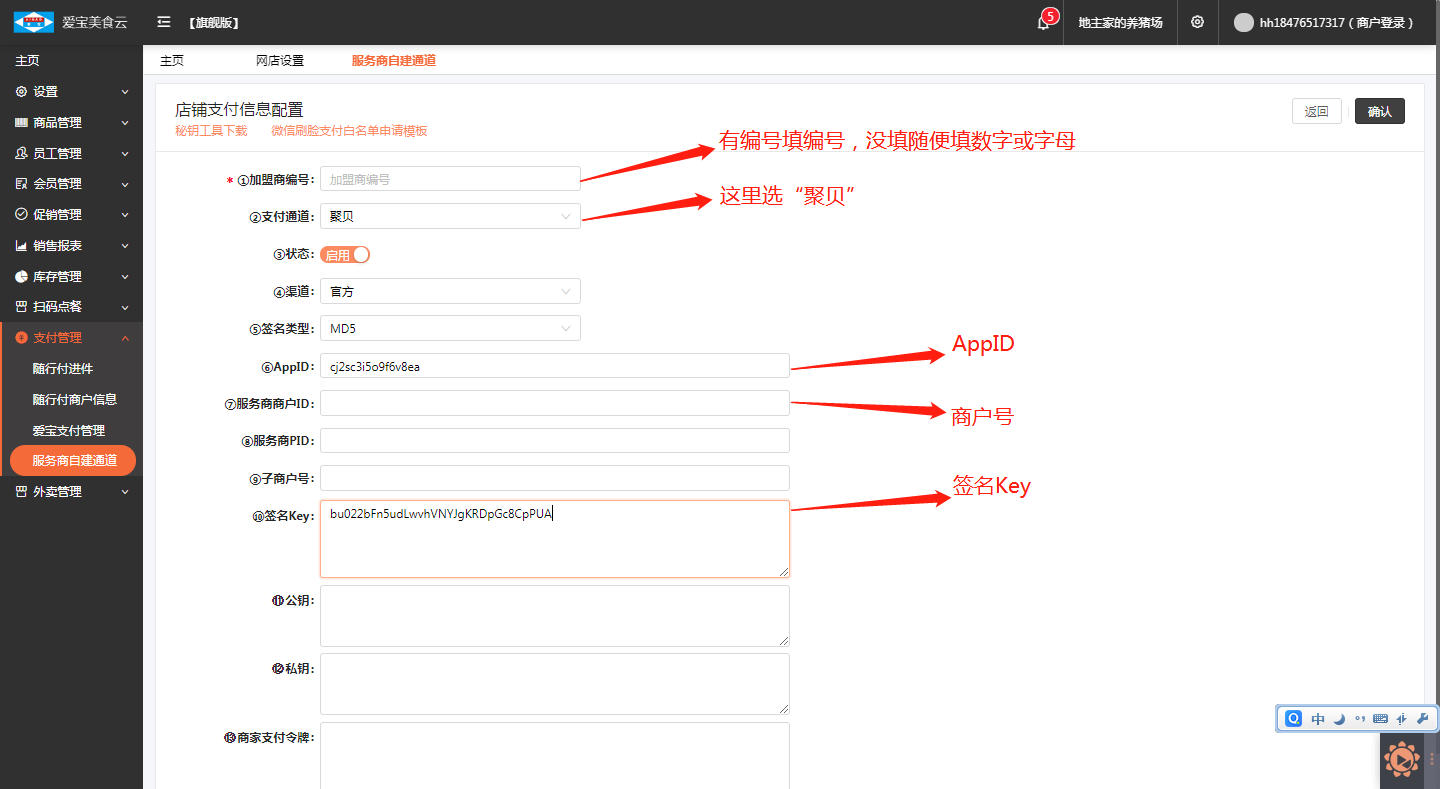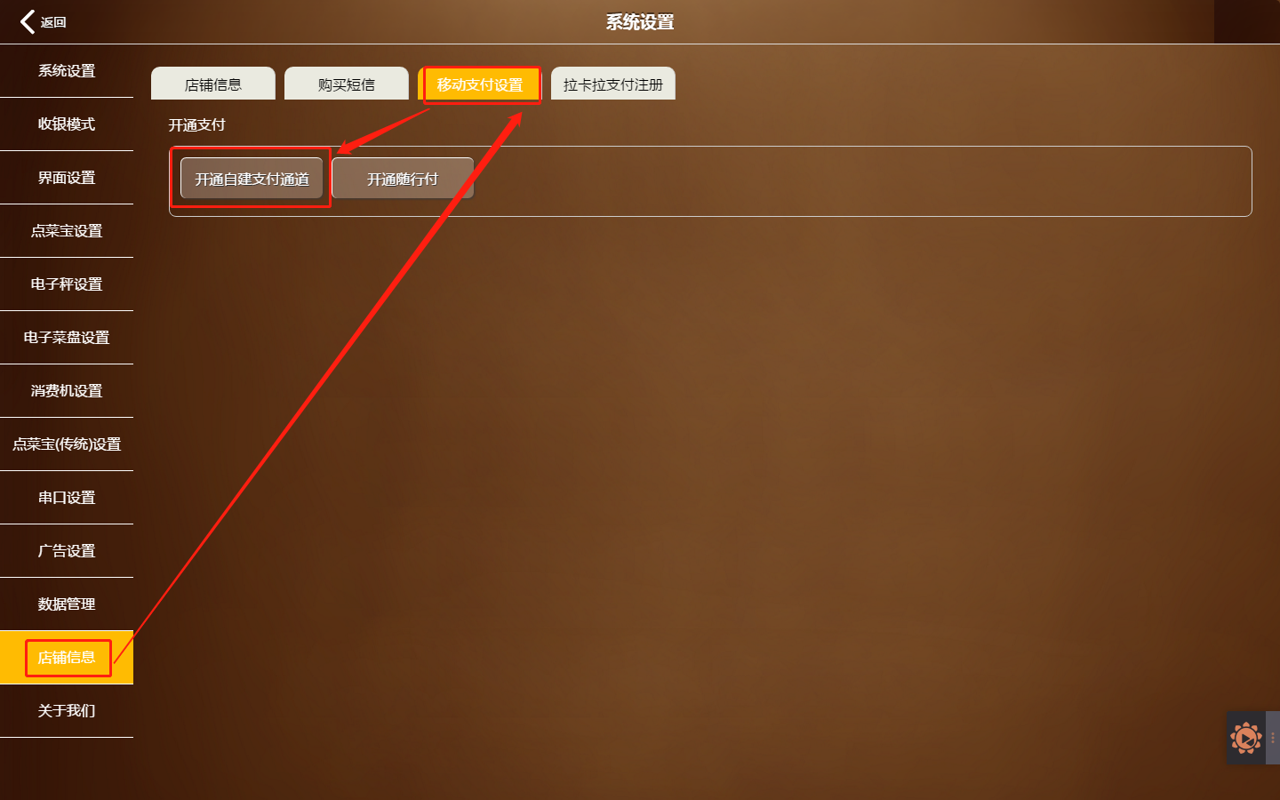 5.配置美食云前台。登录爱宝云美食云前台,进入系统设置,店铺信息,移动支付里选择开通官方支付通道(如下图)