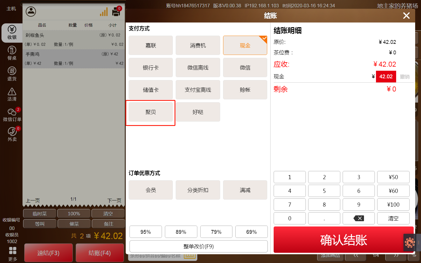 6.配置收银前台,前台收款时付款式请选择【聚贝支付】如下图所示