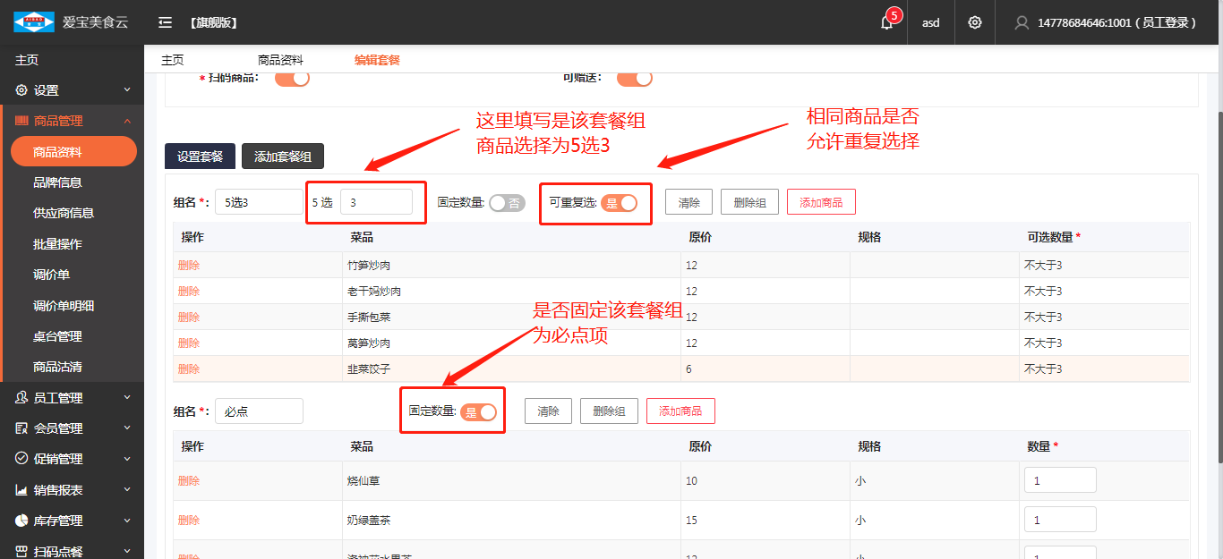 第二步,填写对应的套餐组和套餐内的商品信息,将合适的商品放在对应的套餐组内;可以点击【添加套餐组】来新增套餐组,然后添加商品。