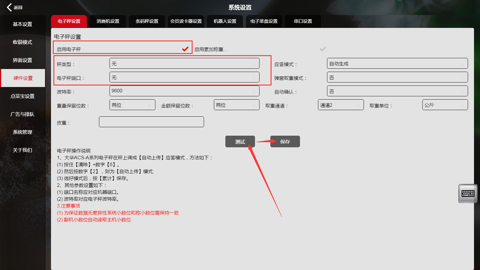 2.电子秤设置-----目前只支持顶尖或者大华电子秤---按照电子秤说明操作 设置好后点击测试后点击保存如下图