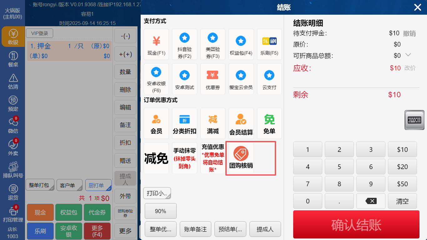 操作流程:先到后台新建一个和抖音代金券一样规则的优惠券,到前台结账界面选择“代金券”支付方式,输入客户出示的券码点击查询,然后在抵扣方式中选择刚刚在后台新建的优惠券,输入使用张数,最后确定即可抵扣金额;