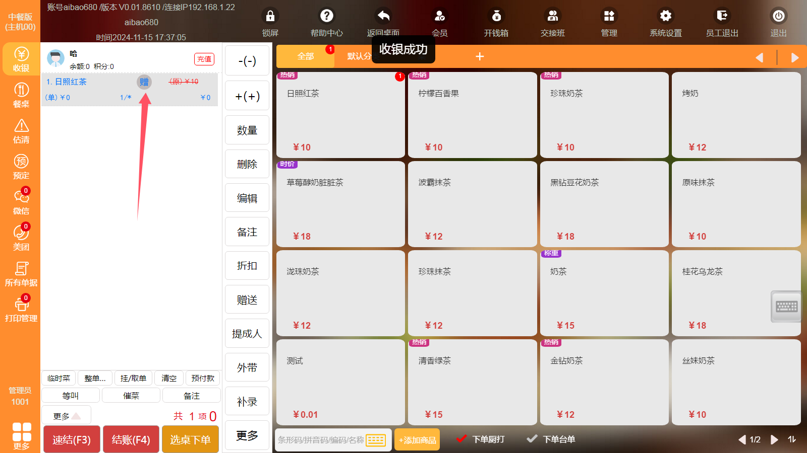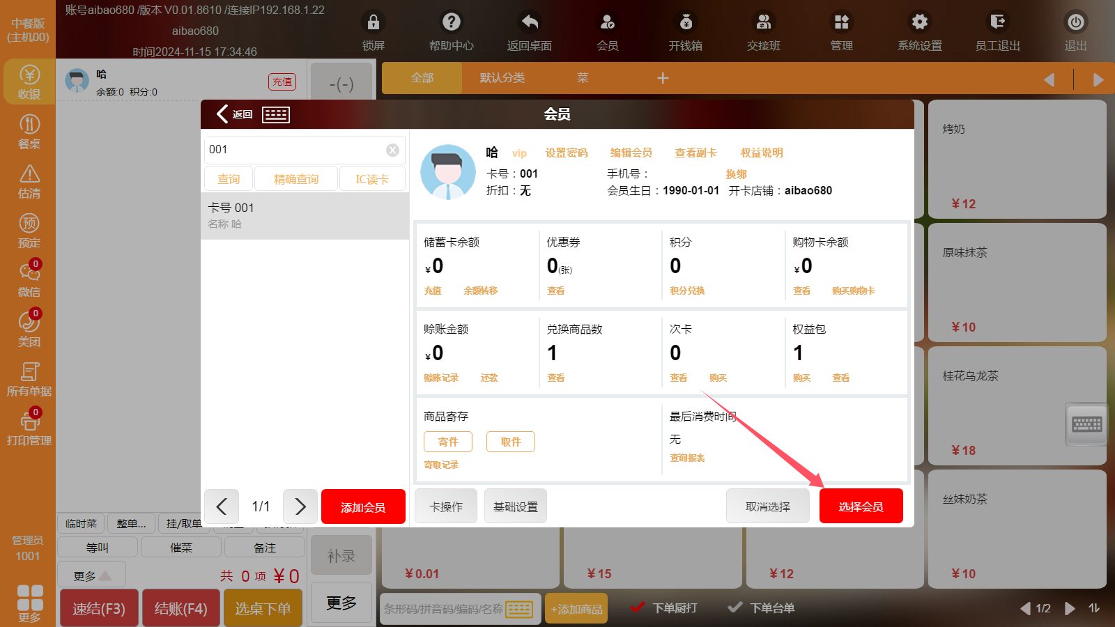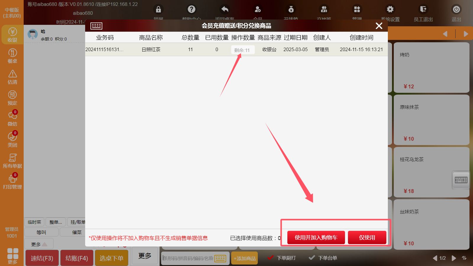 先“选择”会员,再输入要使用的商品数量,最后点击“使用并加入购物车”,购物车里就会显示该商品为赠送商品;