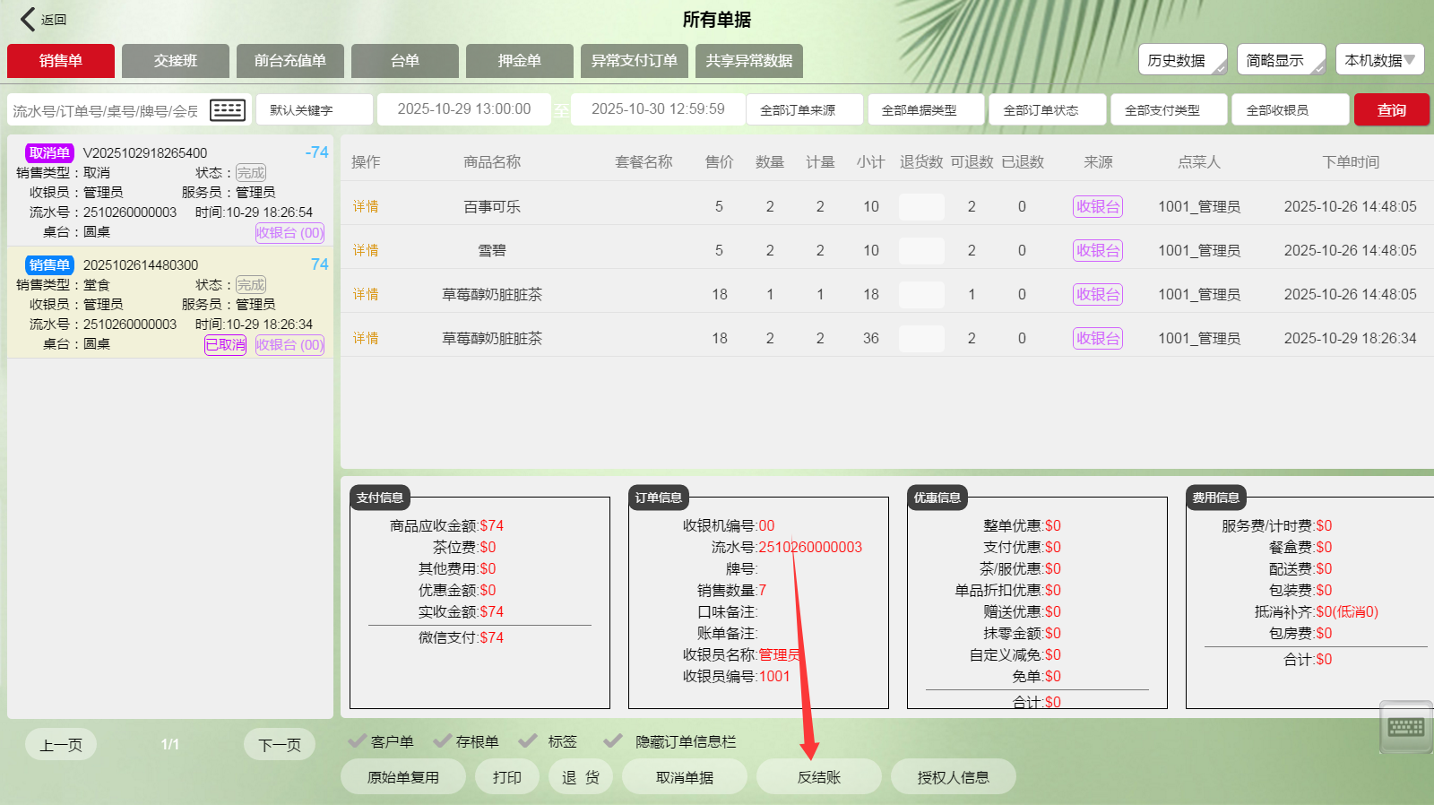 美食云旗舰版结账单取消单据,退货,反结账教程