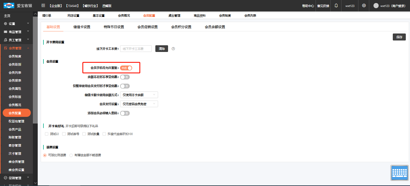 2、在云后台,“会员管理”“会员配置”开启“会员手机号允许重复”