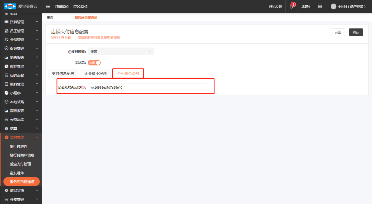 第二步,在【支付管理】--【自建支付通道】中新建银盛支付方式,在【企业版公众号】中配置信息(之前有配置银盛方式的点击编辑)