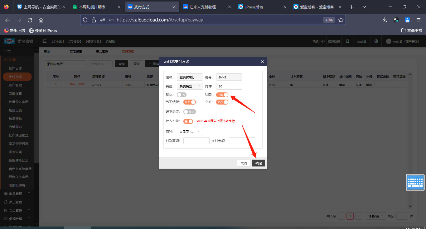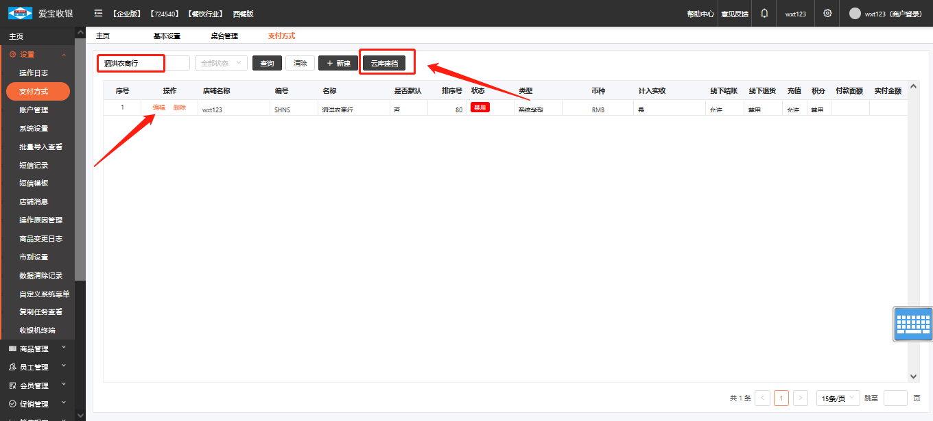 4.在后台【设置】中选择【支付方式】,搜索泗洪农商行或者在“云库建档”添加,将【泗洪农商行】启用即可