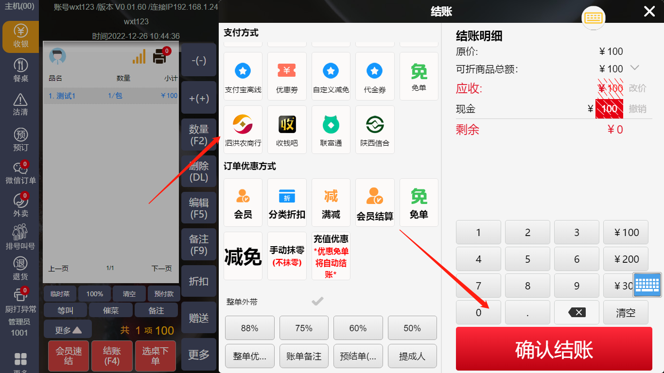 6.前台结账,选用【泗洪农商行】支付,测试是否正常支付成功