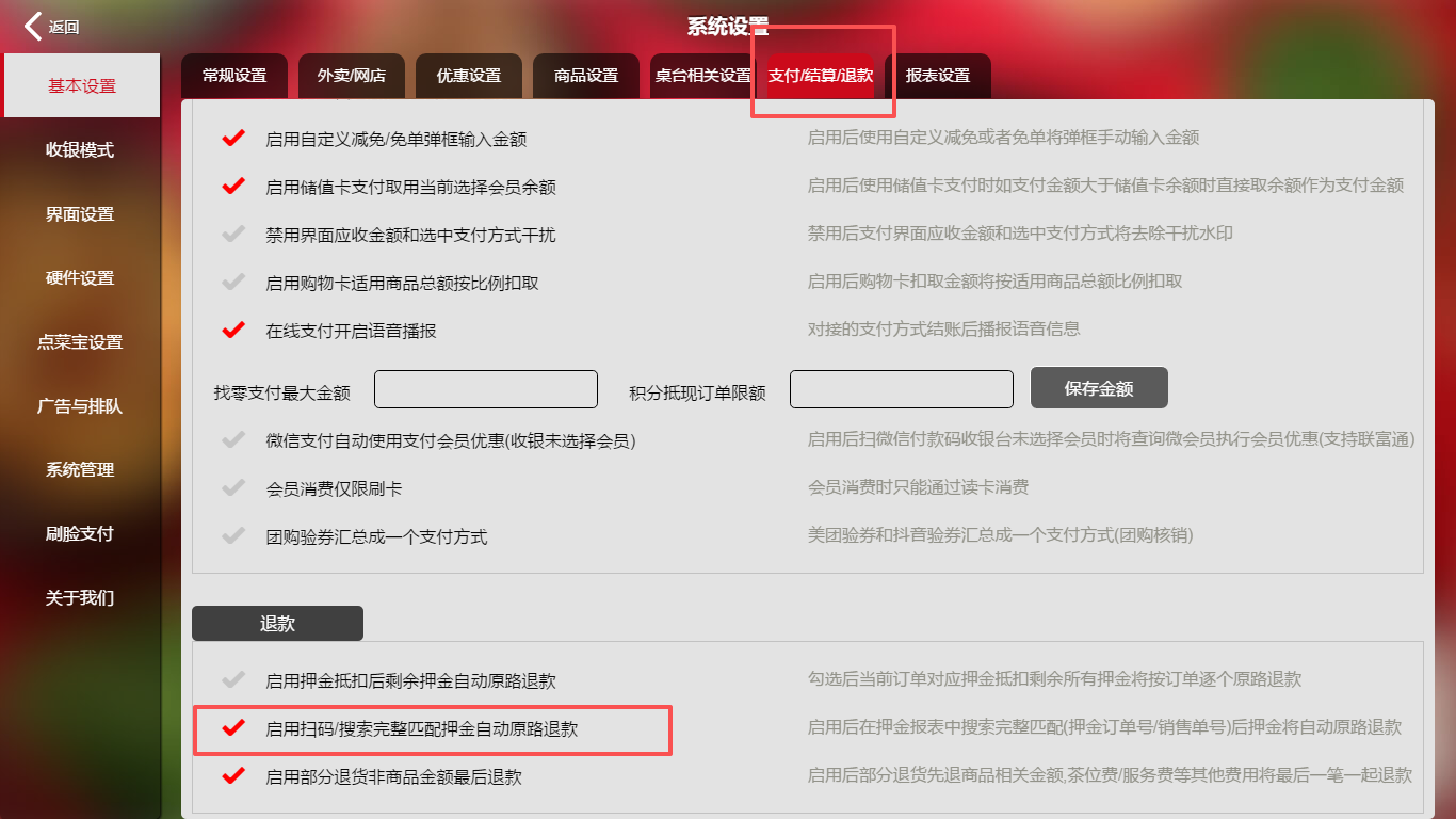在系统设置里勾选启用扫码/搜索完整匹配押金自动原路退款